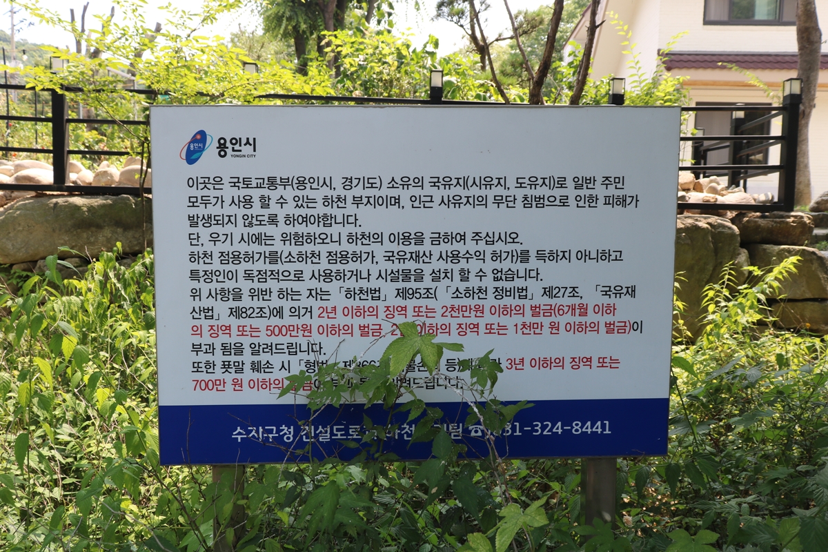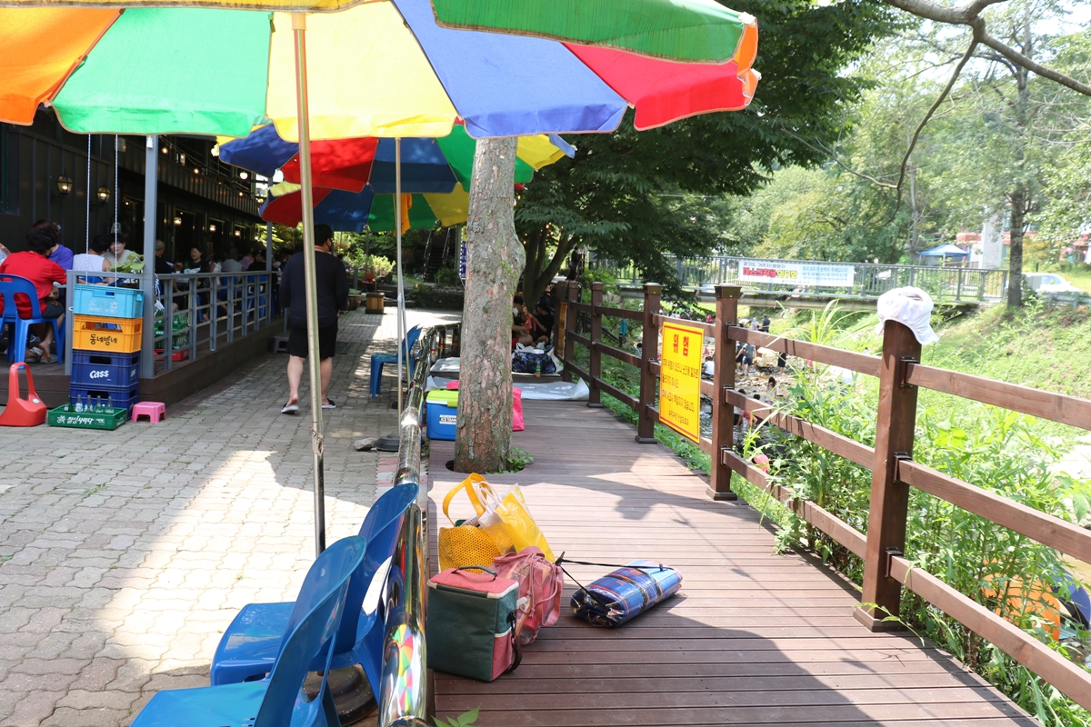 예전에는 고기리계곡 일대는 음식점과 카페가 하천 주변에 평상을 설치하는 등 점유하고 있었습니다. 이번에 가보니 용인시 수지구청이 하천 주변에 설치한 평상이 있었습니다. 평상에는 수지구청의 자산이라는 문구가 적혀 있었습니다. 이곳을 방문하는 누구나 사용 가능한 평상이죠.