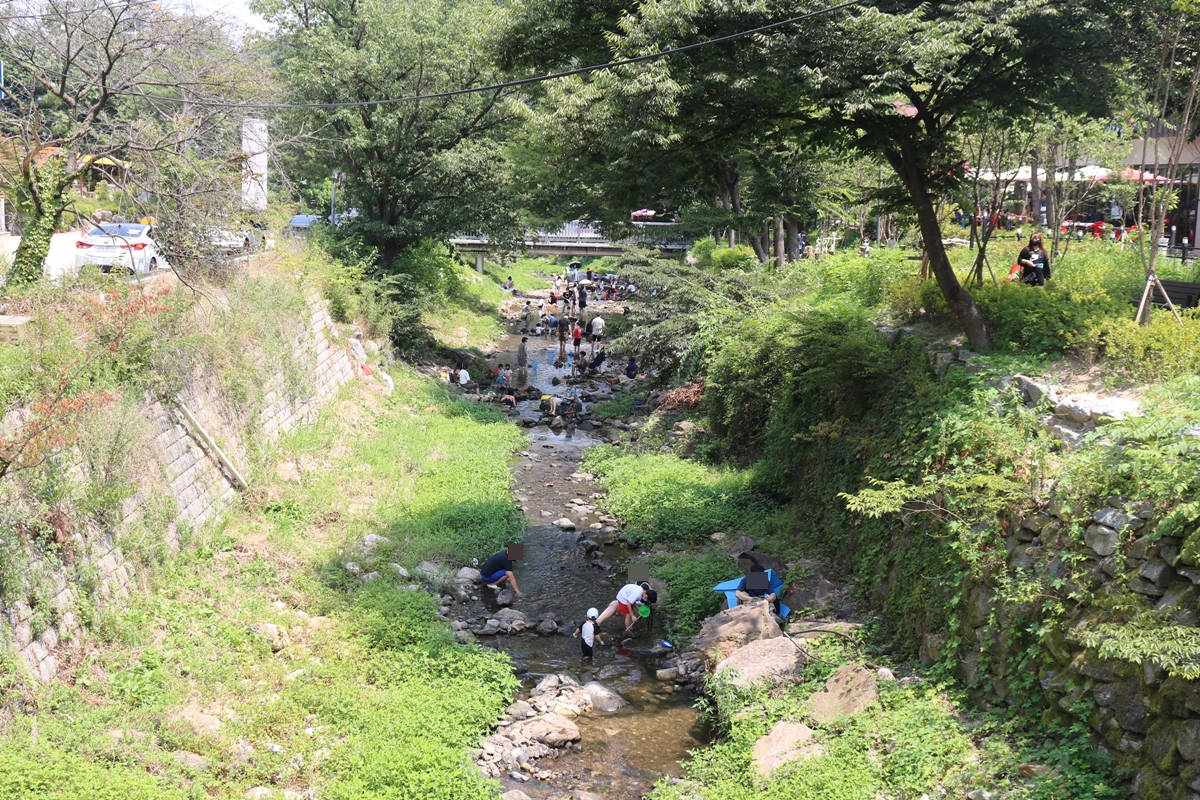 계곡 아래를 보니 많은 시민이 더위를 식히고 있습니다. 대부분 휴가를 맞이해 가족 단위로 오신 분들입니다. 장마가 끝나고 불볕더위가 계속되어 계곡물이 적은 게 조금 아쉽지만요, 광교산 자락에서 내려오는 맑고 차가운 물에 발을 담그며 한여름을 만끽하고 있습니다. 저도 신발을 벗고 들어가고 싶은 정도로 말이죠. 수심이 깊지 않고 물살이 세지 않아 아이들이 안전하게 놀 수 있는 계곡입니다.