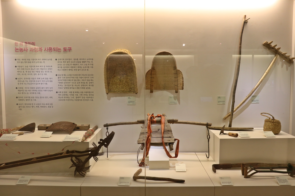 화성지역에서 논농사, 밭농사할 때 사용하던 도구입니다. 키, 삼태기, 밭 호미, 지게, 호미 등을 전시하고 있습니다. 각 도구마다 어떤 용도로 쓰였는지 자세한 설명도 있습니다. 키는 옛날에 이불에 오줌을 싸면 머리에 쓰고 이웃에 소금 얻으러 갔죠. 그럼 이웃이 ‘왜 오줌을 쌌느냐?’며 면박을 주고 소금을 뿌려 다시는 오줌을 싸지 못 하게 했죠.