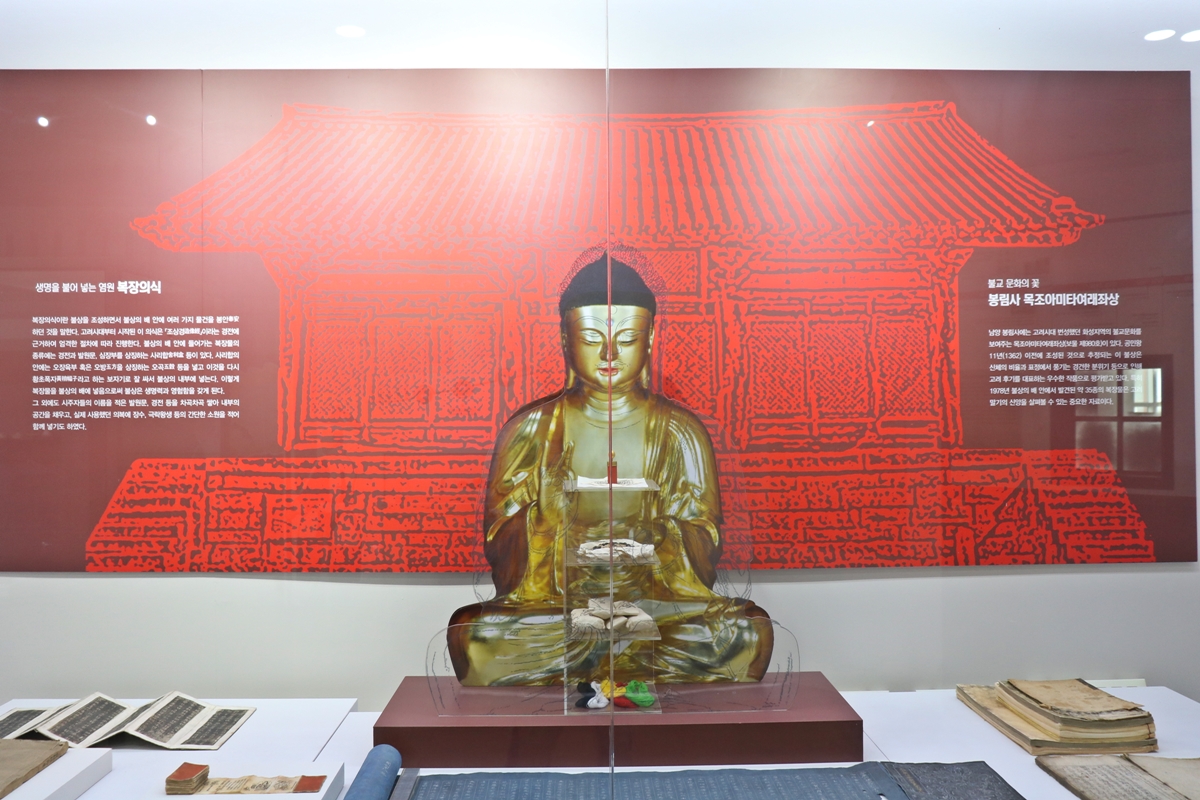 화성시의 사찰 중 봉림사에는 불교문화의 꽃이라 불리는 목조아미타여래좌상이 있습니다. 보물 제980호입니다. 이 불상은 신체의 비율과 표정에서 풍기는 경건한 분위기 등으로 고려 후기를 대표하는 작품이라고 합니다. 화성지역의 번성했던 불교문화를 엿볼 수 있습니다.