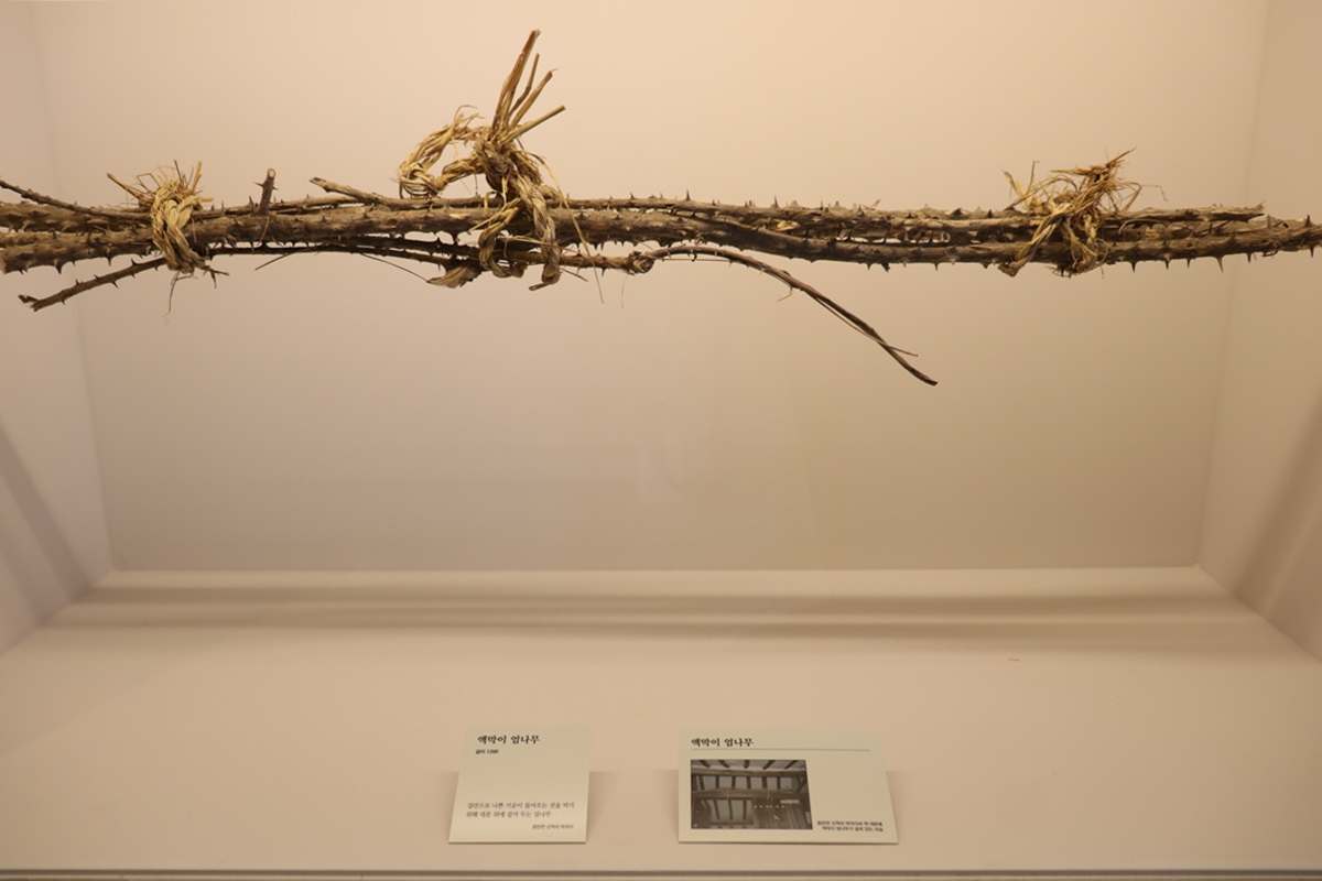 이게 뭔지 아시나요? 대문의 액막이를 하던 엄나무입니다. 문 앞에 가시 돋친 엄나무를 걸어두면, 밖에 있던 나쁜 기운들이 가시에 찔릴 것을 두려워하여 집 안으로 들어오지 않는다고 믿었습니다. 가정 신안의 일종이죠.
