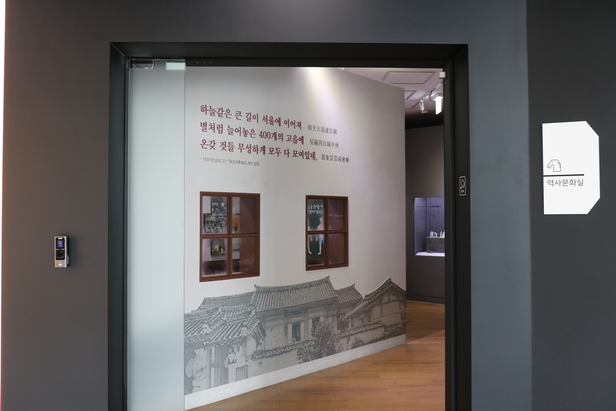 다음은 역사문화실입니다. 이곳은 융건릉 AR 체험, 근대교육 전시 패널 등을 통해 고대에서 근대까지의 화성시 역사와 문화의 변천사를 볼 수 있습니다.
