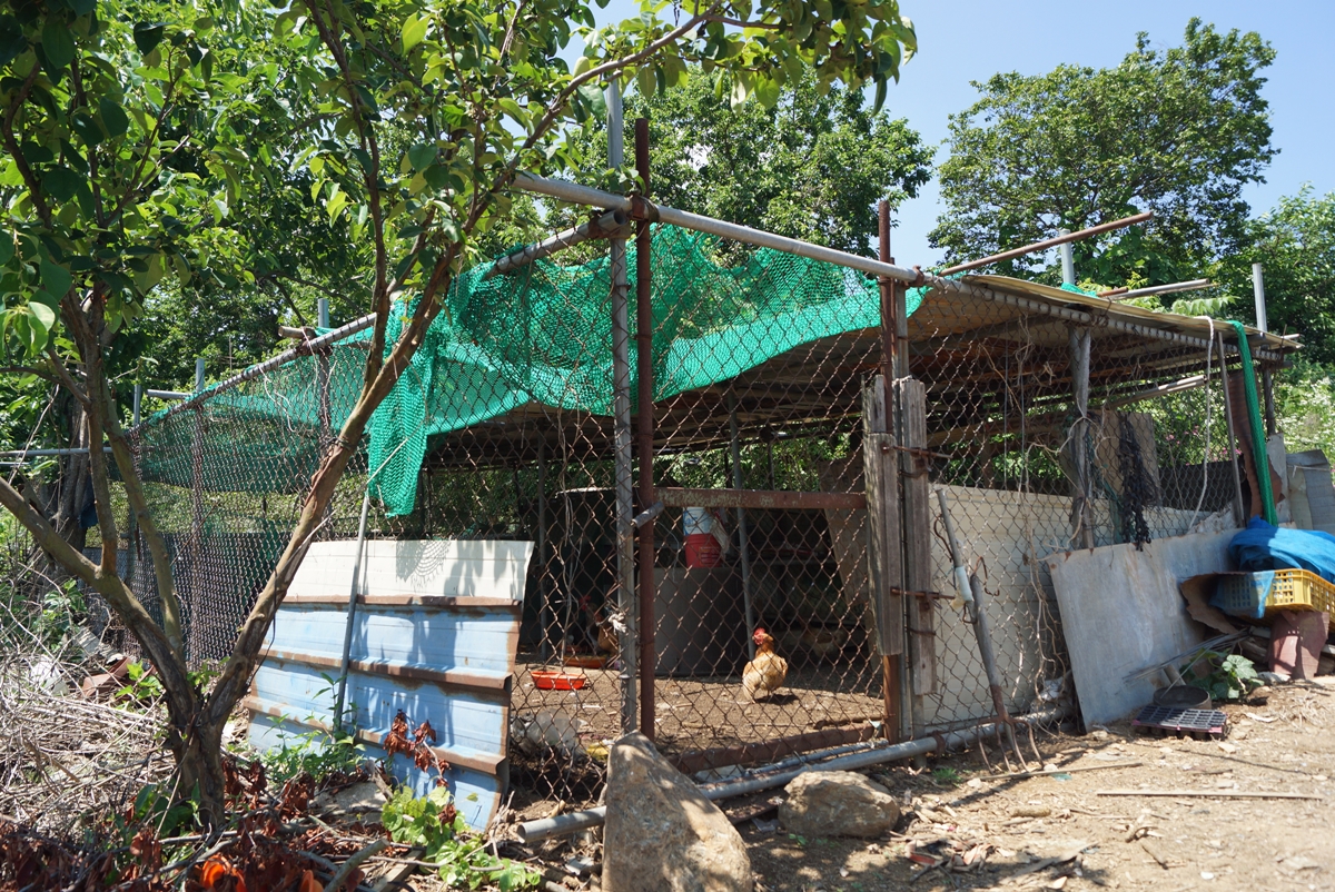 사랑채 옆쪽으로 쪽문이 나 있습니다. 이곳을 올라가 보니 담장 뒤로 텃밭이 있습니다. 텃밭에는 오이, 가지, 호박, 옥수수 등이 싱싱하게 자라고 있습니다. 닭장도 있어서 아침마다 '꼬끼오~' 하는 닭 울음소리를 들을 수 있습니다. 전형적인 시골 마을 풍경입니다.