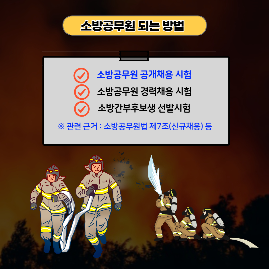 소방관이 되는 방법은 소방공무원 공개채용 시험, 소방공무원 경력채용 시험, 소방간부후보생 선발 시험 등 다양합니다. 소방공무원법 제7조(신규 채용)에 근거하는데요, 소방관이 되는 방법을 알아보겠습니다.