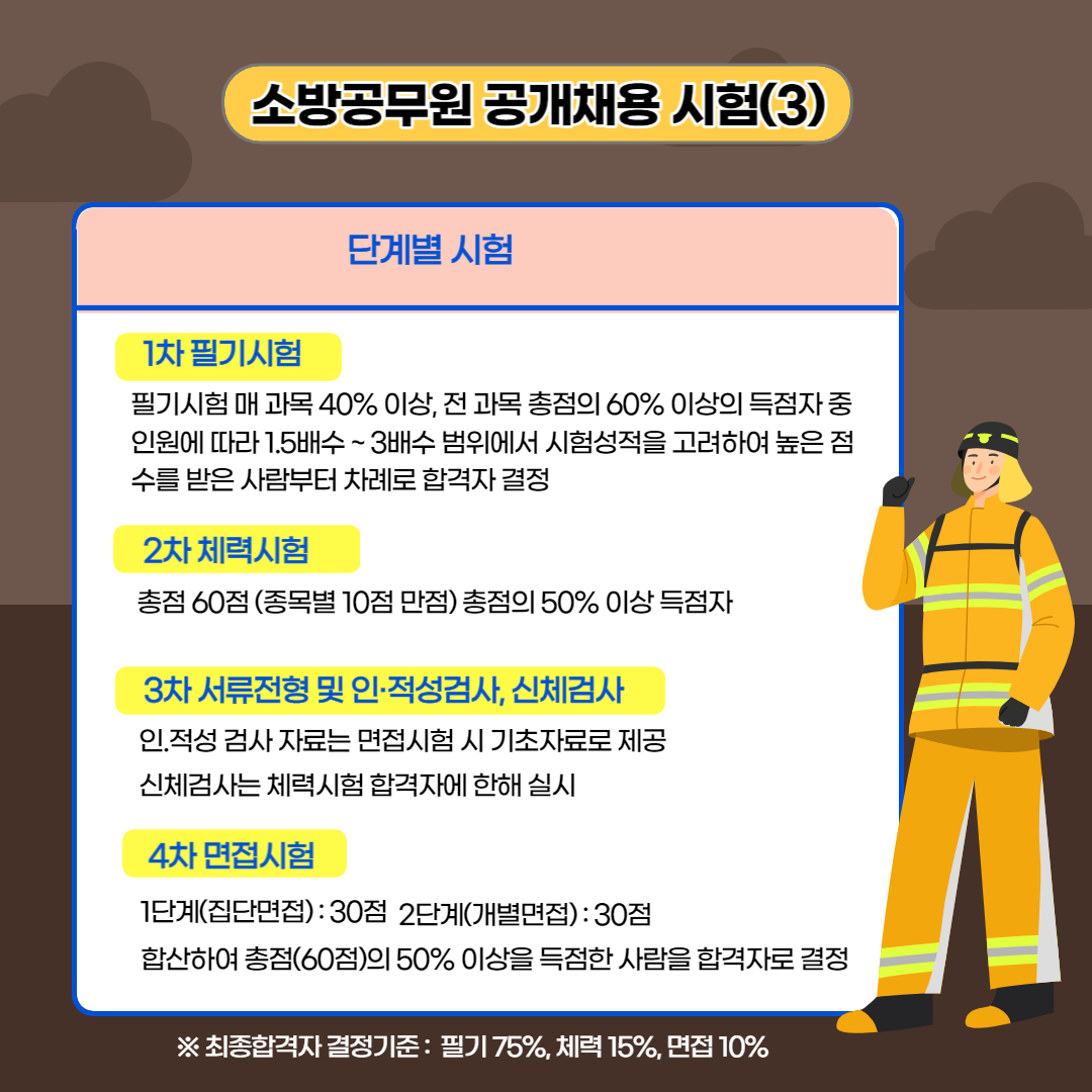 최종합격자 결정은 필기 75%, 체력 15%, 면접 10% 합산점수 중 고득점순으로 선발 예정 인원 범위 내에서 합격자를 결정합니다.
