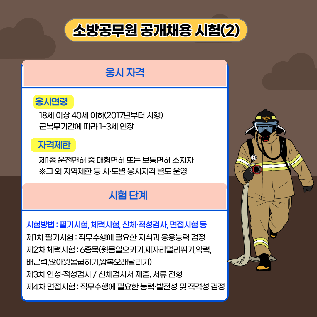 응시 자격은 18세 이상 40세 이하(2017년부터 시행)이며, 군 복무기간에 따라 1~3세 연장됩니다. 군 가산점 혜택이죠. 자격 제한으로 제1종 운전면허 중 대형면허 또는 보통면허 소지자입니다. 소방관으로 활동하려면 운전은 필수니까요. 그 외 지역 제한 등 시·도별 응시 자격을 별도로 하는 곳도 있습니다.