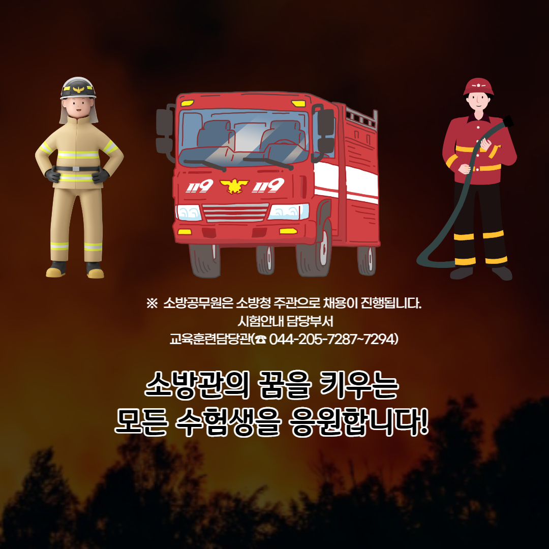 지금까지 소방관이 되는 방법과 시험에 대해 알아봤습니다. 소방관은 소방청 주관으로 채용이 진행됩니다. 앞서 언급한 대로 특정직 공무원이라 정년이 보장되는 안정된 직업이죠. 하지만 화재예방과 구급활동 중 위험에 뛰어드는 경우도 많습니다. 국민의 생명과 재산을 지키는 숭고한 일을 하는 소방관은 국민의 든든한 수호천사입니다. 소방관의 꿈을 키우는 모든 수험생을 응원합니다.