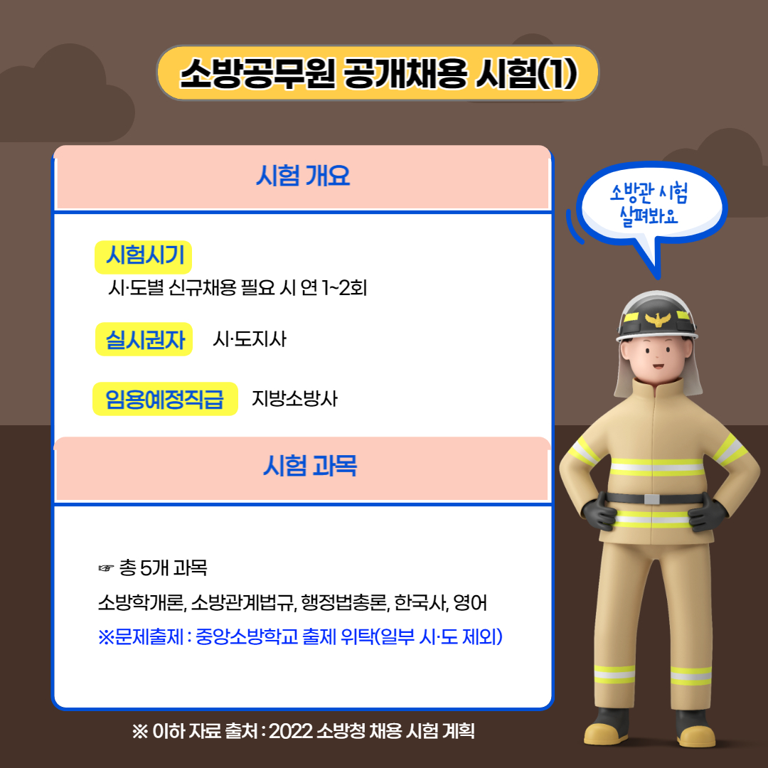 소방관 시험은 언제 있는지 궁금하시죠. 소방공무원 공채는 시·도별로 신규 채용이 필요할 때 연 1~2회 실시합니다. 시·도지사가 실시하는데요, 소방공무원이 지방직으로 전환됐잖아요. 그래서 합격 시 지방소방사로 임용됩니다.