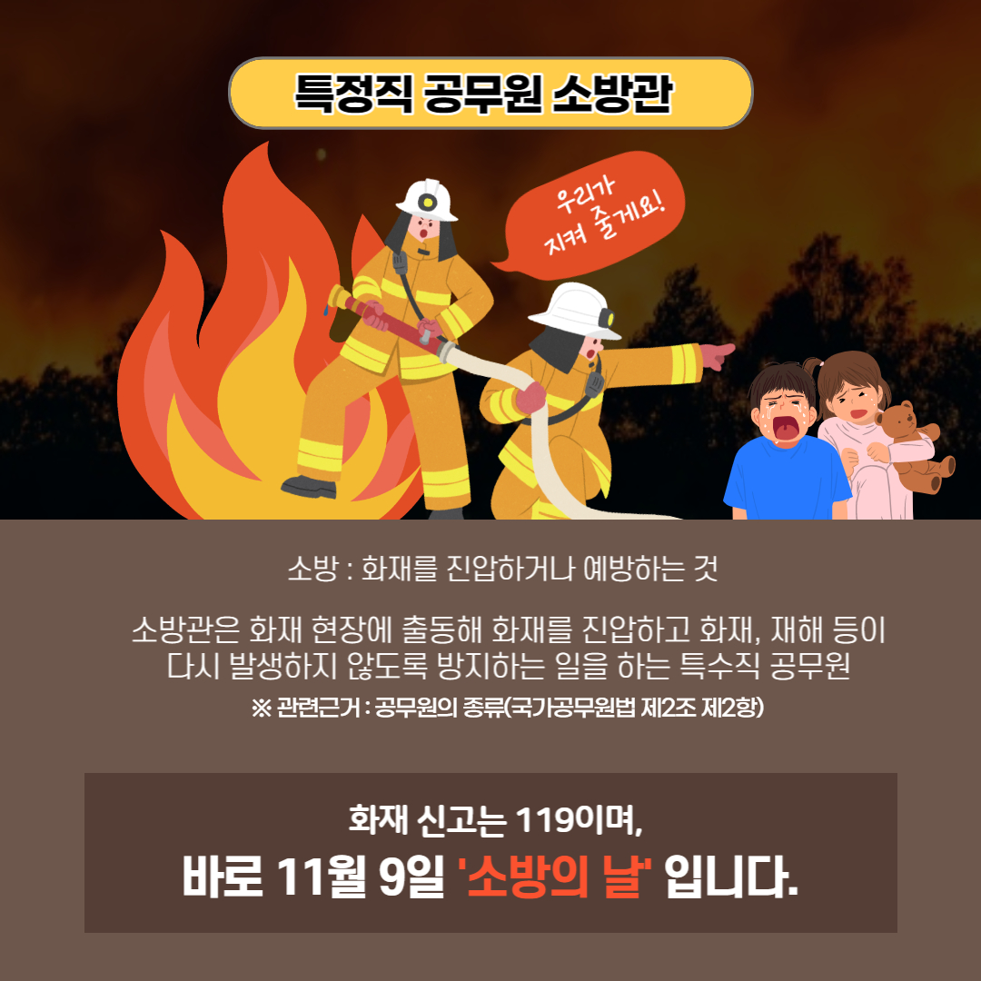 다 아시겠지만요, 소방관은 화재 현장에 출동해 화재를 진압하고 화재, 재해 등이 다시 발생하지 않도록 방지하는 일을 하고 있습니다. 여기서 소방은 화재를 진압하거나 예방하는 일을 말하죠. 요즘은 소방관이 화재 출동보다 구조 출동이 훨씬 많습니다. 그만큼 우리 주변에 없어서는 안 될 존재죠.