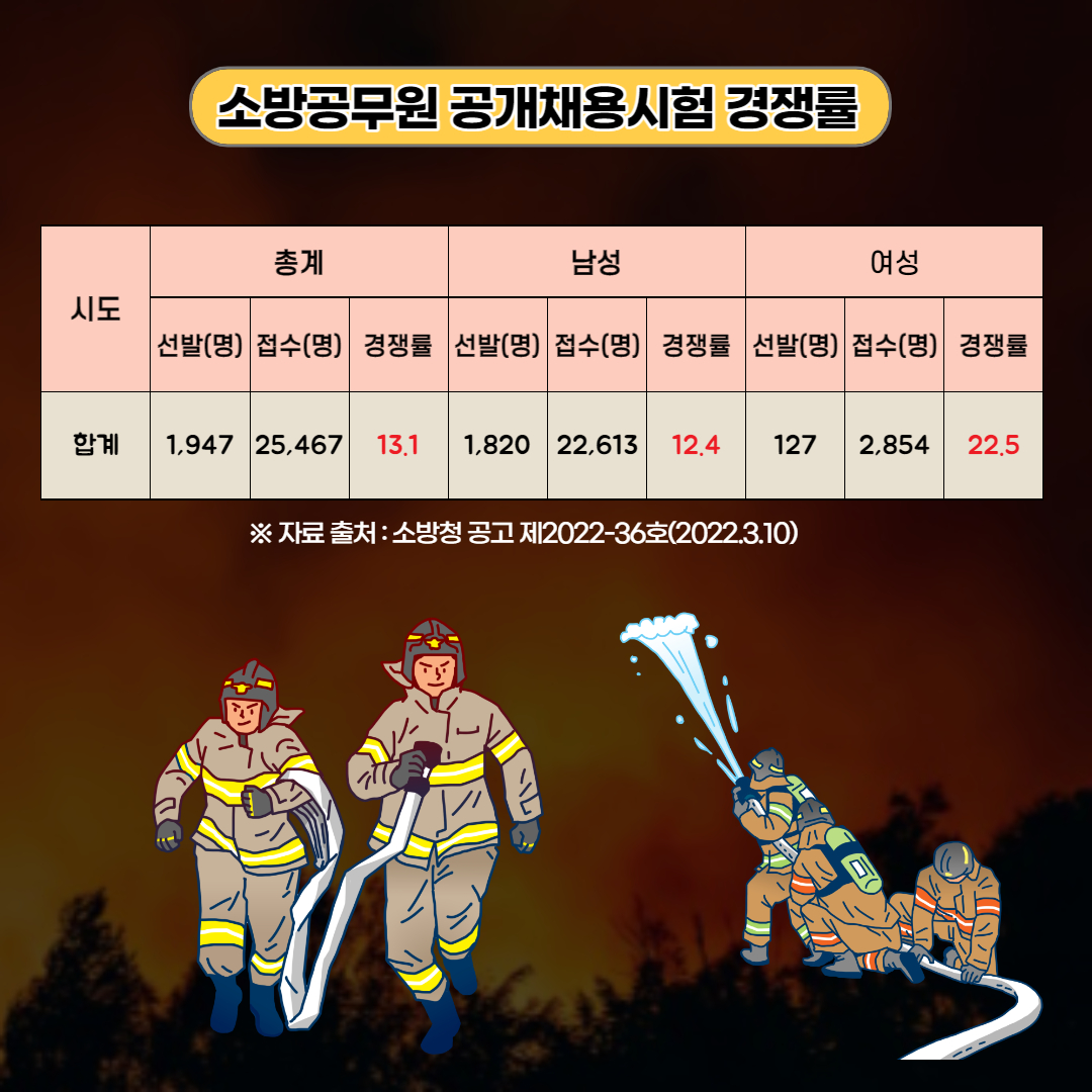 올해 3월에 소방청이 발표한 공채 경쟁률을 보면 전체 경쟁률은 13.1대 1입니다. 이중 남성은 12.4대 1, 여성은 22.5대 1로 여성이 높습니다.