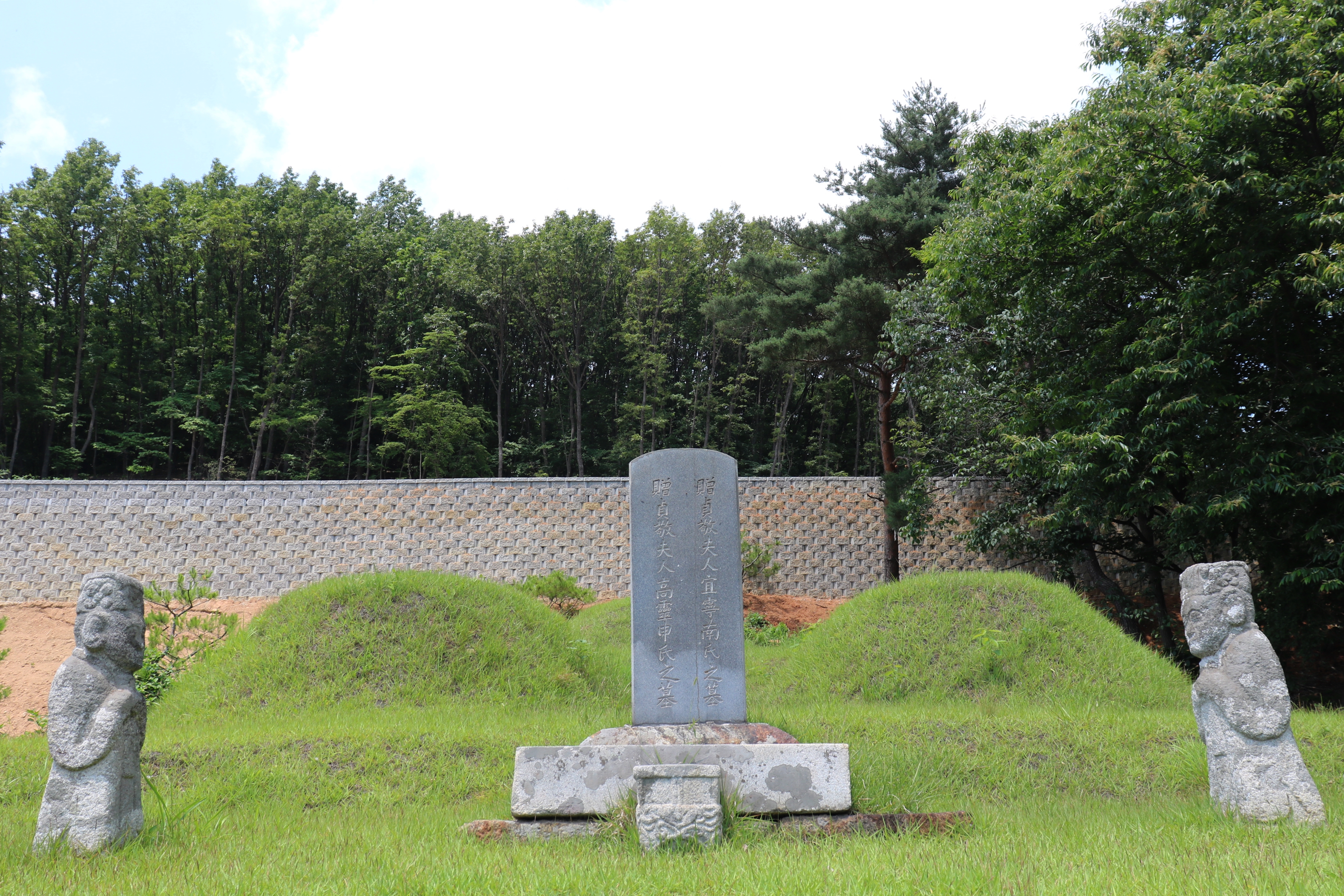계단은 그리 많지 않습니다. 올라보니 오달제 묘소 앞에는 두 부인의 묘소가 있습니다. 묘 앞에는 상석, 향로석, 좌우에는 문인석과 동자승이 지키고 있습니다. 그리고 망주석도 있습니다. 두 부인의 묘비를 보니 증 정경부인 고령신씨 지묘(첫째 부인)와 정경부인 의령남씨 지묘(둘째 부인)라고 쓰여 있습니다. 조선 시대는 부인 외에 후처도 둘 수 있었죠. 그래서 오달제 부인의 묘가 두 개가 있습니다.