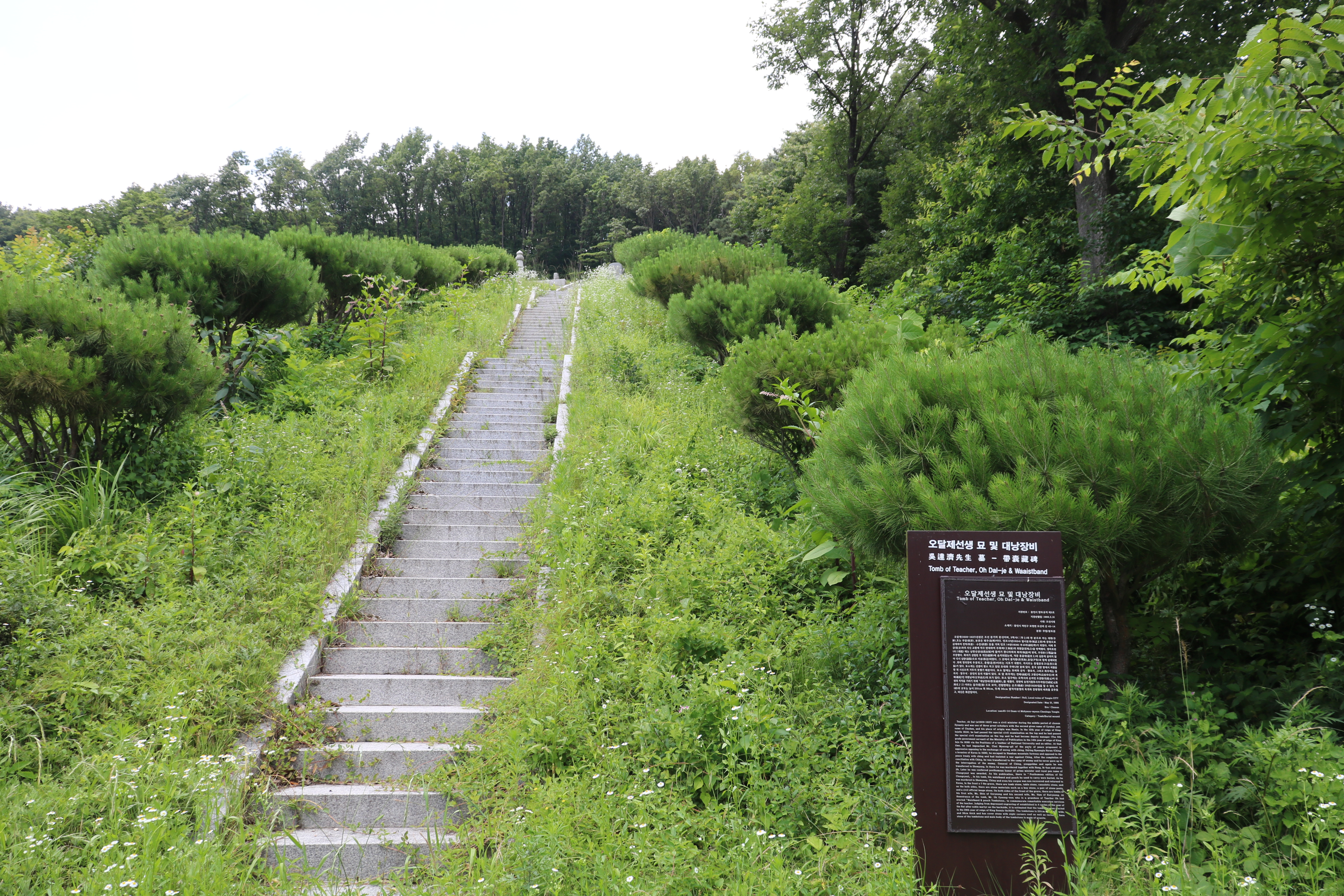 대낭장비에서 조금 올라가면 오달제 선생 묘소로 오는 계단이 보입니다. 잡초가 많이 우거져 있는데요, 용인시에서 관리를 좀 했으면 좋겠습니다. 계단 앞에 오달제 묘에 관한 안내판이 있습니다. 앞서 소개한 내용이 요약돼 있습니다.