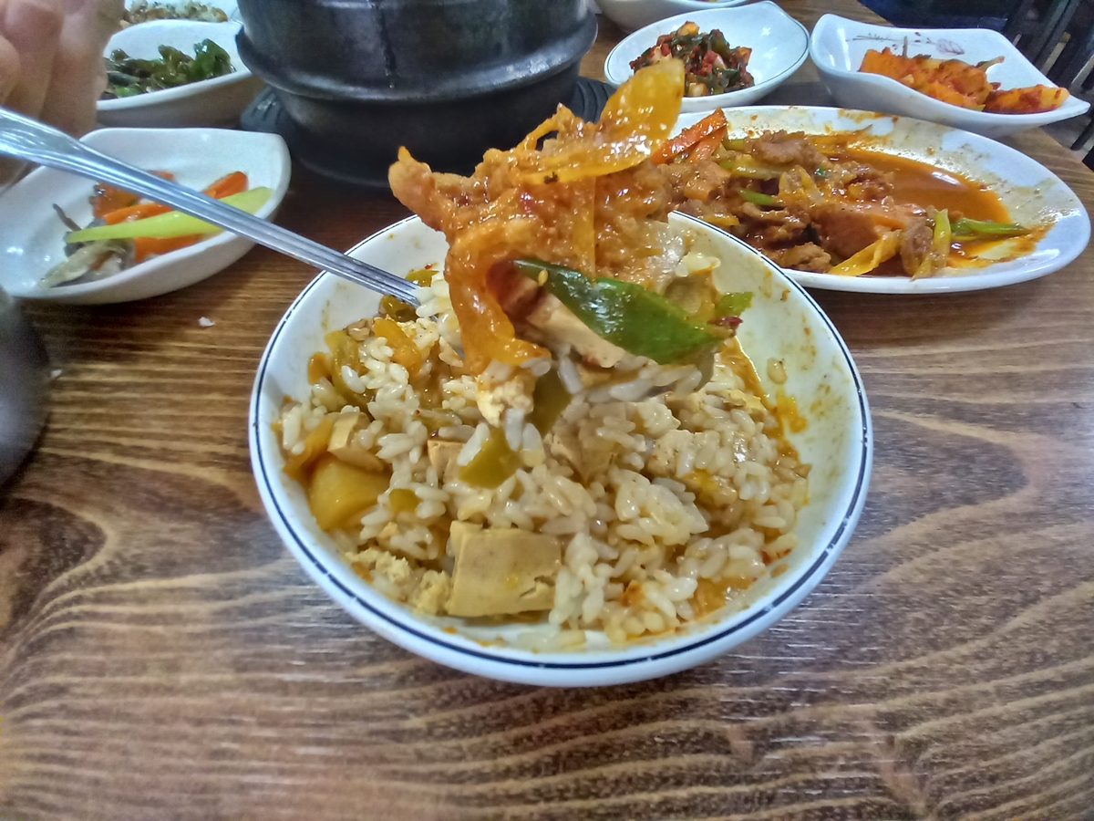 제육볶음과 국물에 밥을 쓱쓱
