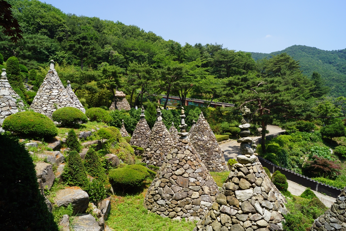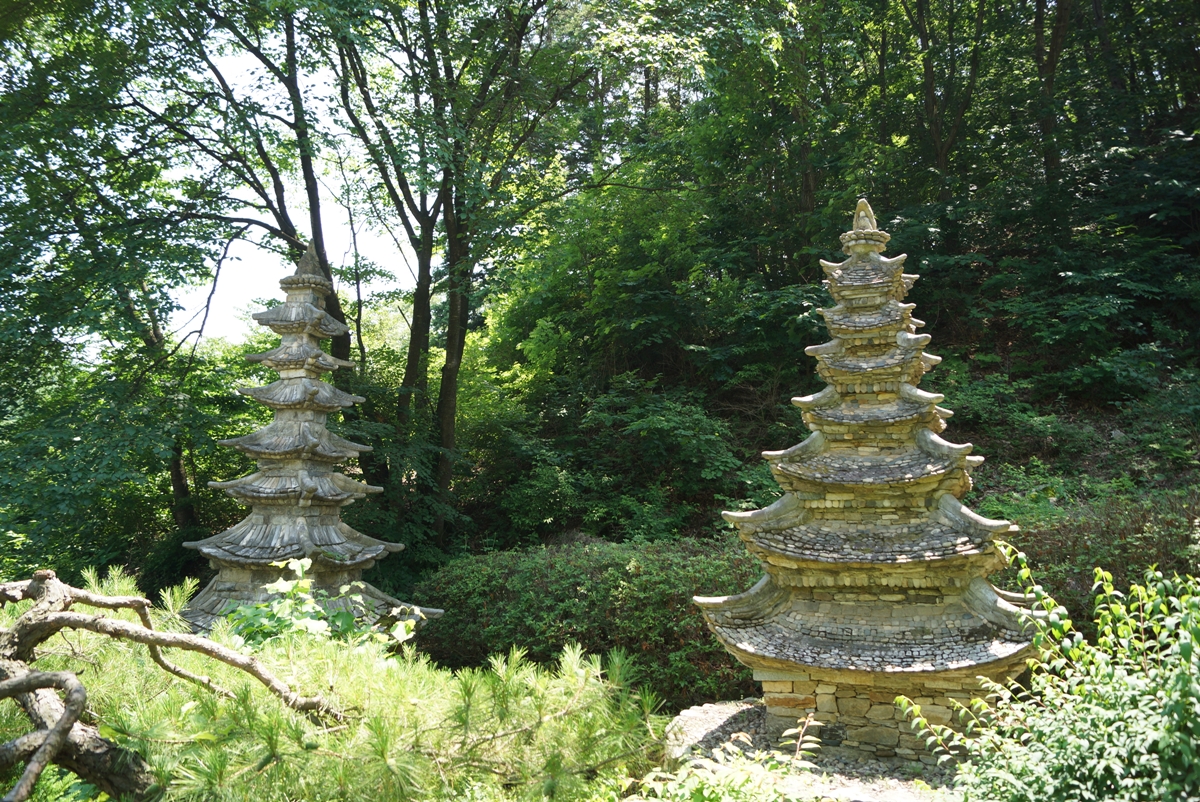 아주 이국적인 탑이죠? 통일의 탑이라고 하네요. 우리나라 절에서 보는 탑과는 좀 다릅니다. 이 탑에 쓰인 돌들은 우리나라뿐만 아니라 세계 각지에서 가져온 돌이라고 합니다. 백두산, 히말라야, 불교 성지에서 가져온 돌인데요, 탑은 하나가 아니라 여러 개가 줄지어 서 있습니다.