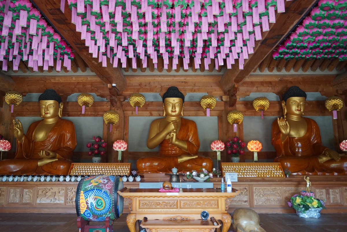 대웅보전 안에는 황동 85,000근을 인도에서 공수해 10년 동안 만든 장육존상 오존불이 있습니다. 오존불은 관세음보살, 아미타여래좌상, 비로자나불, 석가여래좌상, 대세지보살이죠. 보기에는 평범한 것 같은데 세계 최대 규모라고 하니 다시 한번 보게 되네요.