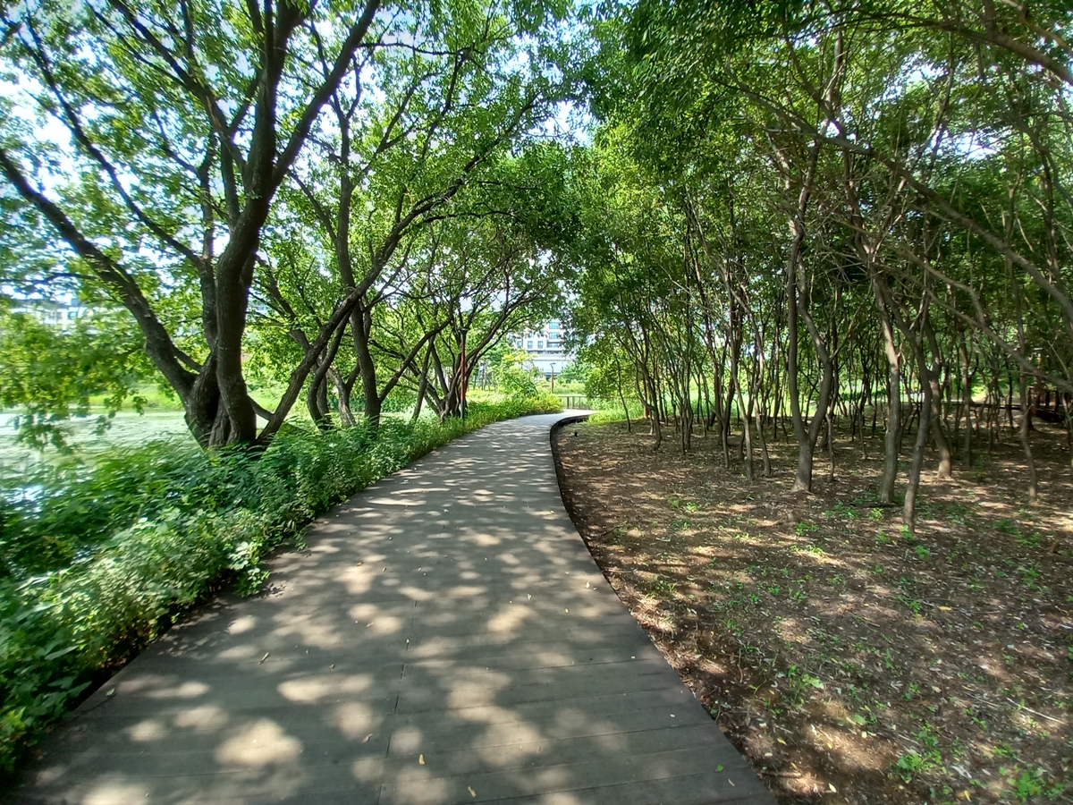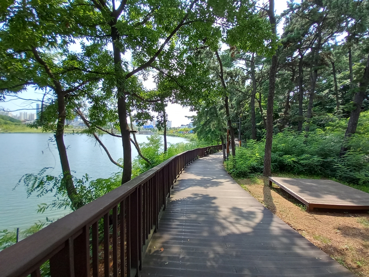 정숙옹주 태실지를 가기 위해 제방가로원으로 향했습니다. 나무데크 길 우측에 버드나무가 군락지를 이루고 호수 바람이 불어 시원했습니다.