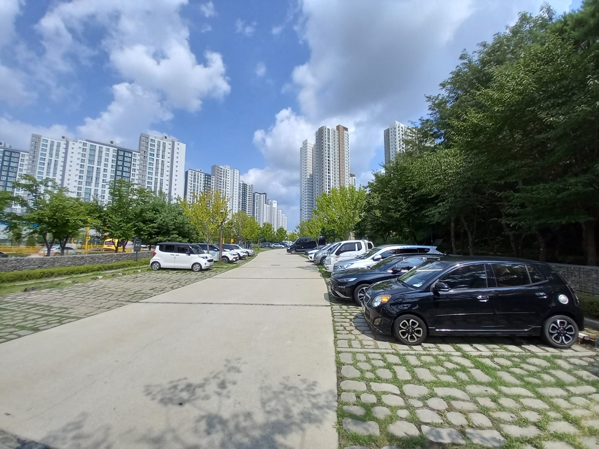 정숙옹주 태실지를 가려면 방교초등학교 맞은편에 있는 공용주차장에 차를 세우고 가는 것이 좋습니다. 이곳에서 가는 것이 가장 짧게 갈 수 있거든요. 평일 낮에 가서 그런지 주차장은 여유가 있었습니다. 주차장에는 전기차 충전시설도 갖춰져 있습니다. 이곳 주차는 무료입니다.