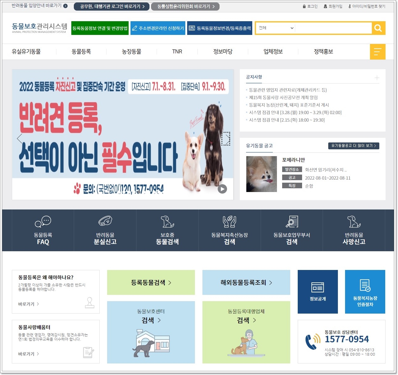 농림축산식품부(이하 농식품부)는 유기 동물관리에서 동물등록에 이르기까지 동물보호 업무 전반을 통합적으로 관리하기 위해 각 시도(시군구)의 동물보호 업무 담당 부서와 연계하여 동물보호관리시스템을 운영하고 있습니다.