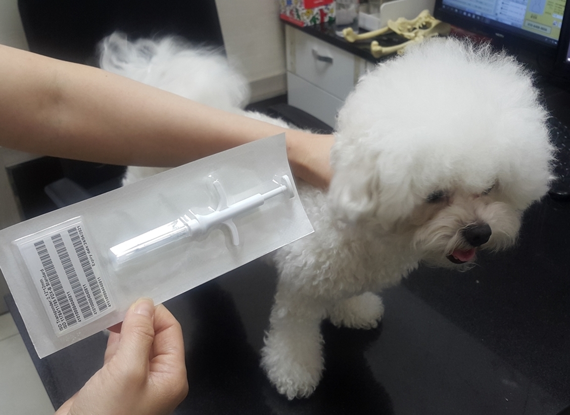 첫째, 내장형 무선식별 장치는 마이크로 칩을 동물 몸에 삽입(주사)하는 겁니다. 마이크로 칩(RFID, 무전 전자 개체 식별 장치)은 애견에 집어넣어도 체내 이물 반응이 없는 재질로 만들어졌습니다. 코팅된 쌀알만 한 크기입니다. 동물등록은 15자리 번호 부여로 이뤄집니다. 동물병원에서 마이크로 칩을 삽입 후에 등록해 줍니다.