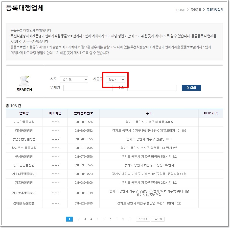먼저 등록기관부터 알아야겠죠. 동물보호관리시스템(www.animal.go.kr)에 들어가 등록 대행업체를 검색하면 가까운 대행업체가 나옵니다. 제가 용인시로 검색해보니 많은 동물병원이 나옵니다. 이 병원 중 동물등록 대행업체인지 아닌지를 전화로 확인해서 등록하면 됩니다.