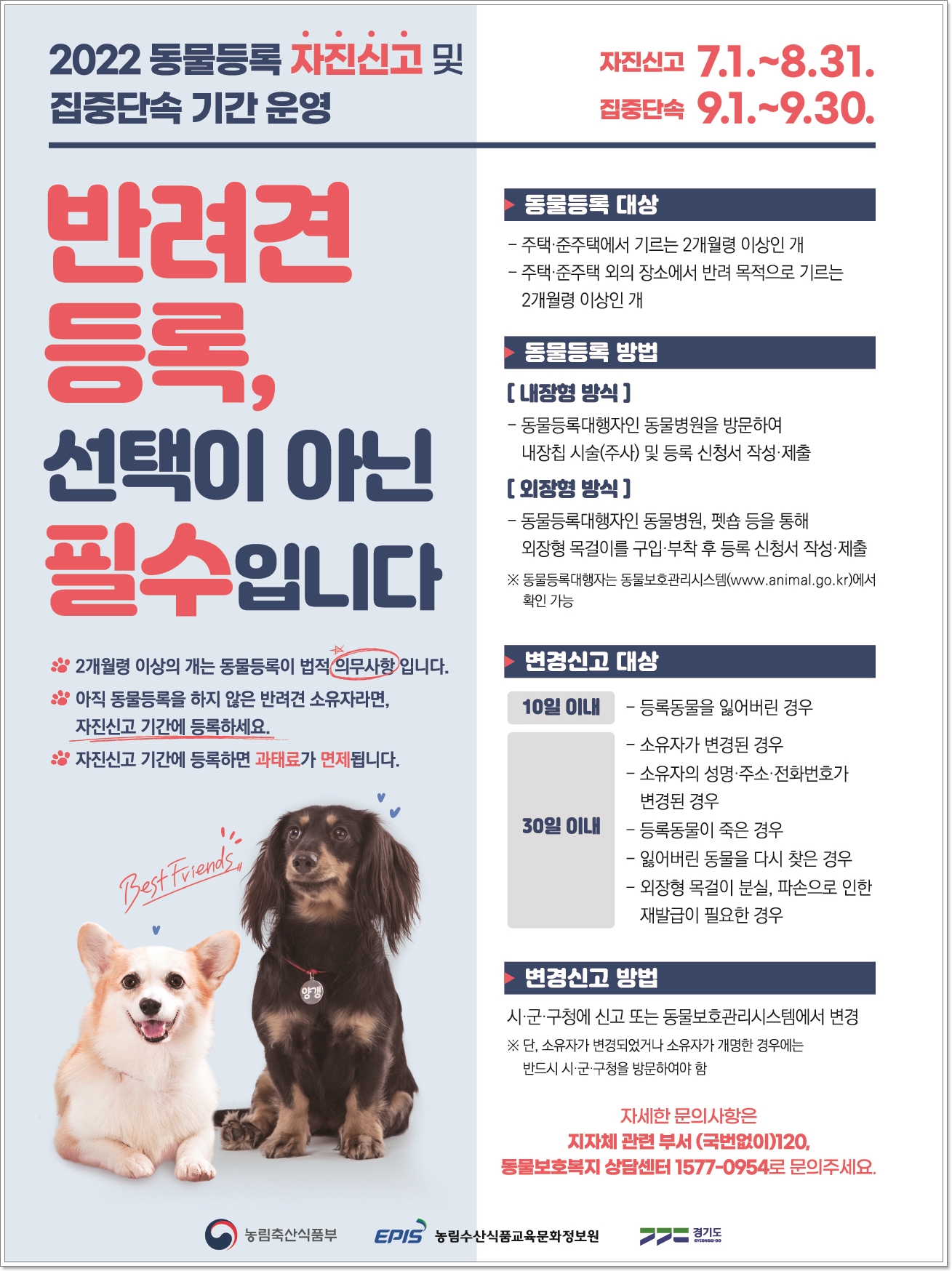 농식품부는 7월 1일부터 8월 31일까지 동물등록 자진신고 기간을 운영합니다. 그리고 9월 1일부터 30일까지 반려견 등록 여부를 집중적으로 단속한다고 합니다. 동물 미등록자나 변경사항 미신고자가 기간 내 신고 시 과태료가 면제됩니다. 내가 키우는 애견 등록은 선택이 아닌 필수입니다. 애견 등록을 하지 않는다면 동물을 키울 자격이 없는 거죠.