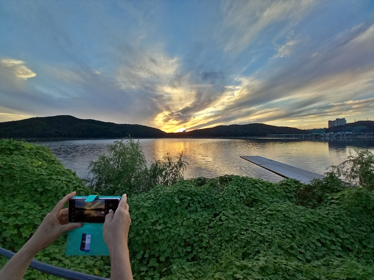 물빛정원에는 많은 시민이 산책을 나왔습니다. 요즘 아침저녁으로는 제법 선선해서 바람 쐬기 좋은데요, 기흥호수공원은 노을이 환상적이죠. 노을은 언제 볼 수 있을까요. 일몰 기준으로 30분 전부터 볼 수 있습니다. 예를 들면 일몰이 6시 30분이면 6시부터 멋진 노을을 볼 수 있답니다. 시민들이 스마트폰으로 멋진 노을을 담고 있습니다.