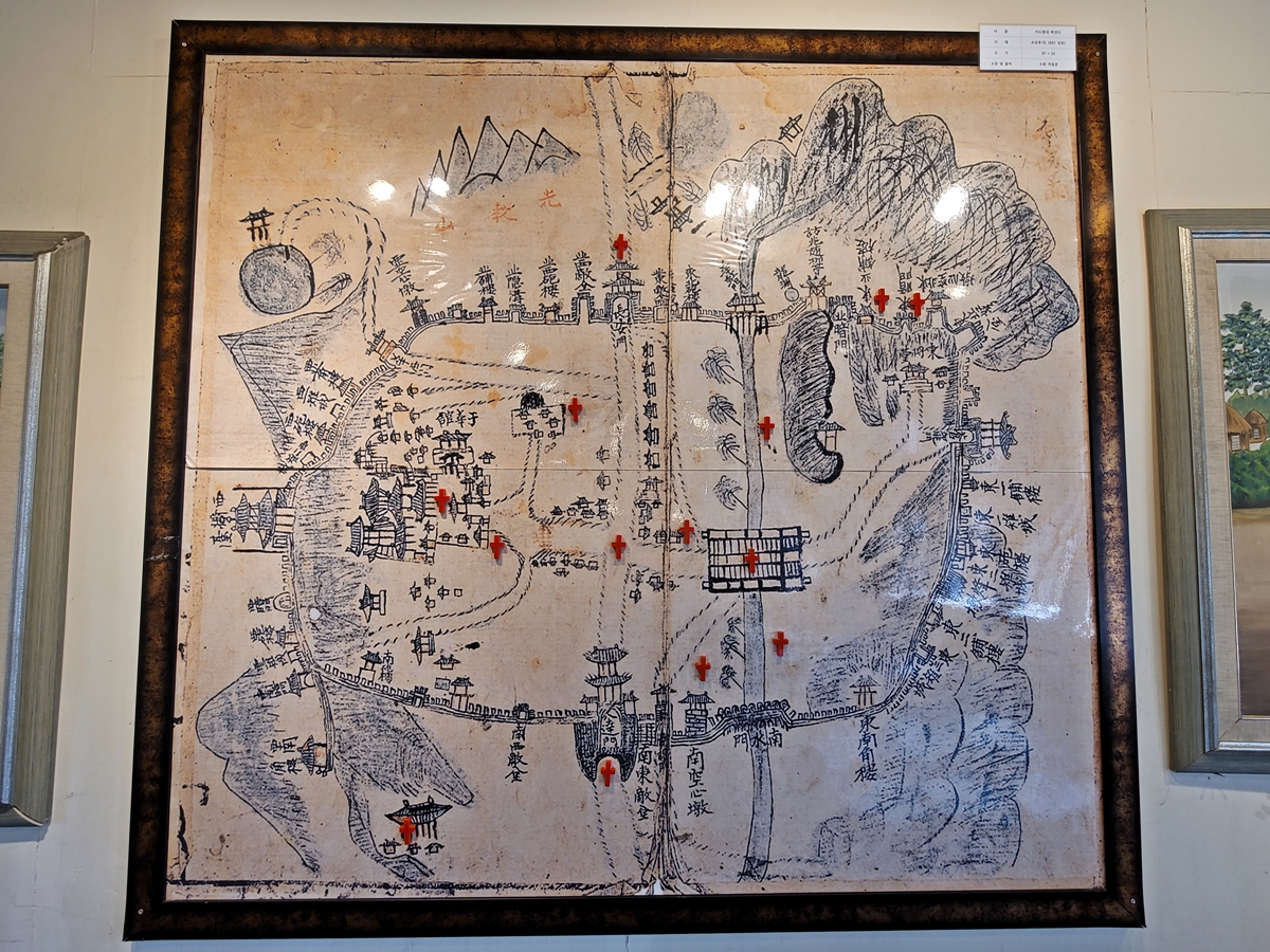 화성의 옛 모습 패널 뒷벽에 지도첩 내 화성도가 붙어있습니다. 조선 후기(1831년 전후)에 만들어진 지도입니다. 지도에 화성 내 천주교 박해 위치가 붉게 표시돼 있습니다. 자세히 보니 화성행궁, 동남각루, 북암문, 화서문 등이 보입니다. 천주교 박해 시대에 화성 내에 성당이 많았음을 알 수 있습니다. 원본은 수원 박물관에 있습니다.
