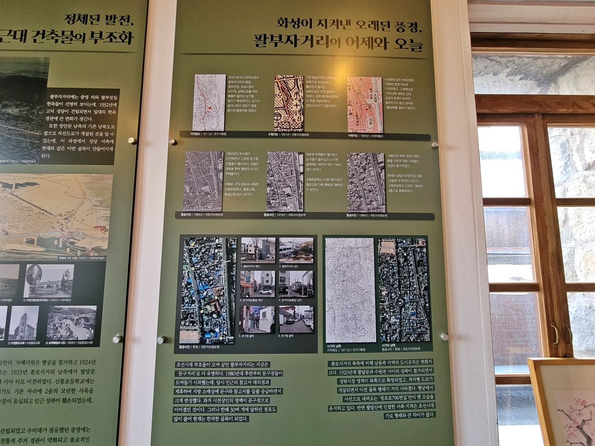 전시 패널은 오래된 흑백 사진이 있습니다. 그중 성당 앞 성모상과 신축 석조 교사 사진이 눈길을 끕니다. 1954년 소화초등학교 모습으로 진귀한 사진이죠. 지금의 뽈리화랑 모습과 크게 다르지 않습니다. 현재 남아 있는 건물은 일부 변형되긴 했지만, 전체적으로 원래의 모습을 보존하고 있어 당시 학교 건축의 형태를 짐작할 수 있습니다.