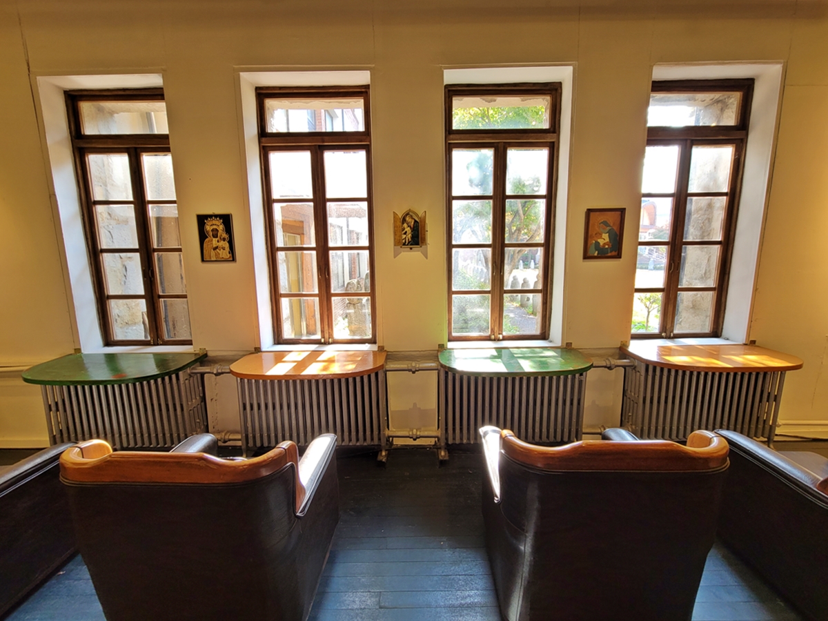 전시실 창가에 의자가 놓여 있고요, 창밖으로 북수동성당 경내가 보입니다. 안락한 소파에 앉아 창밖을 보며 뭔가 생각에 잠길 수 있는 곳입니다.