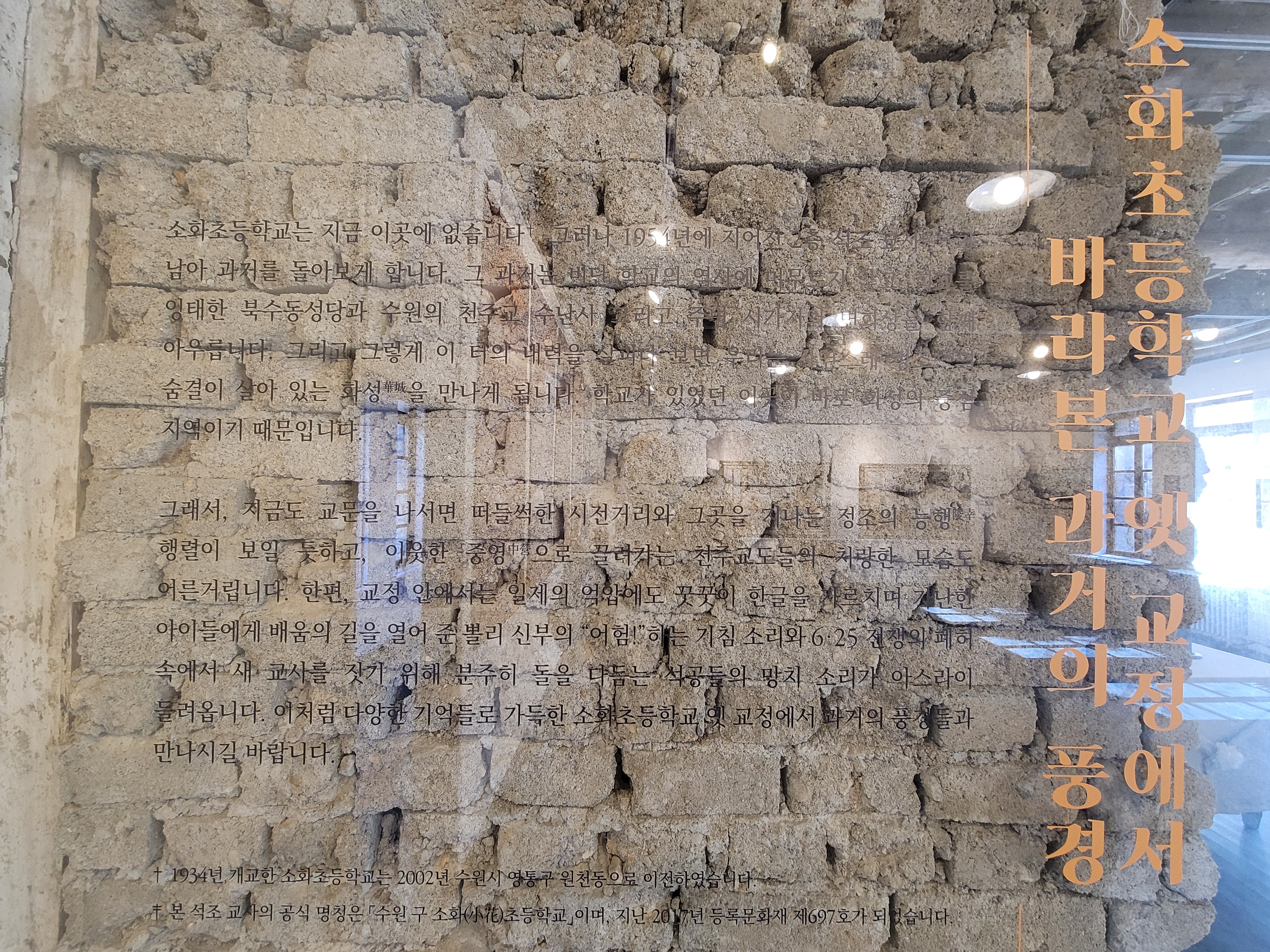 옛날 소화초등학교는 어떻게 지어졌을까요? 그 모습을 원형으로 볼 수 있도록 유리로 본체를 드러나게 해서 전시하고 있습니다. 비록 아이들의 함성은 들리지 않지만, 소화 배움터에서 공부했던 사람들의 흔적이 고스란히 느껴지는 듯합니다.