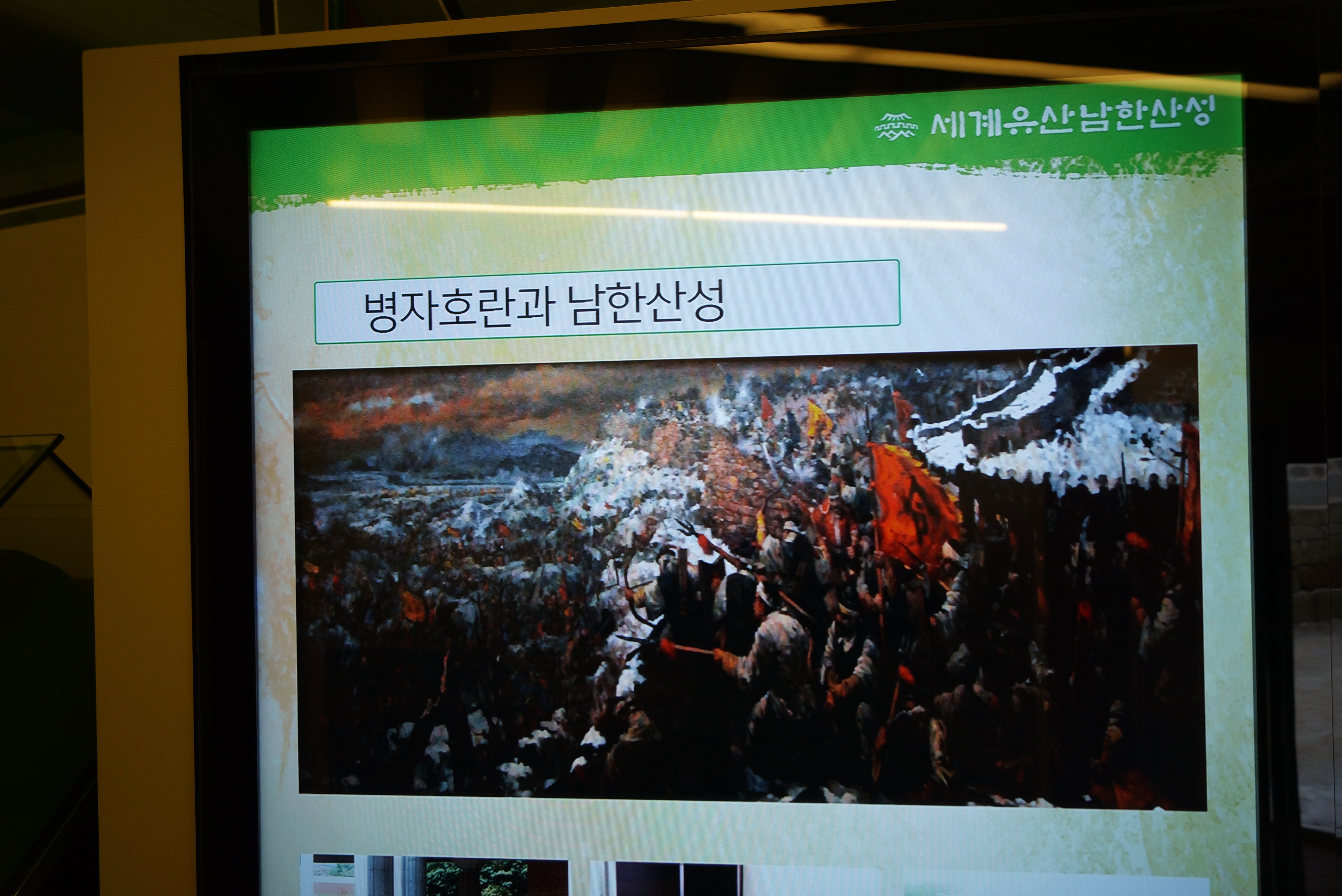 남한산성 행궁 전시실은 세계문화유산인 남한산성은 물론 행궁의 역사를 자세히 설명하고 있습니다. 인조 14년(1636년) 병자호란이 발생하자 인조는 남한산성으로 피난하여 47일간 싸웠습니다. 이후에도 숙종, 영조, 정조, 철종, 고종이 여주와 이천 등의 능행 길에 머물러 이용했던 역사적인 장소입니다.