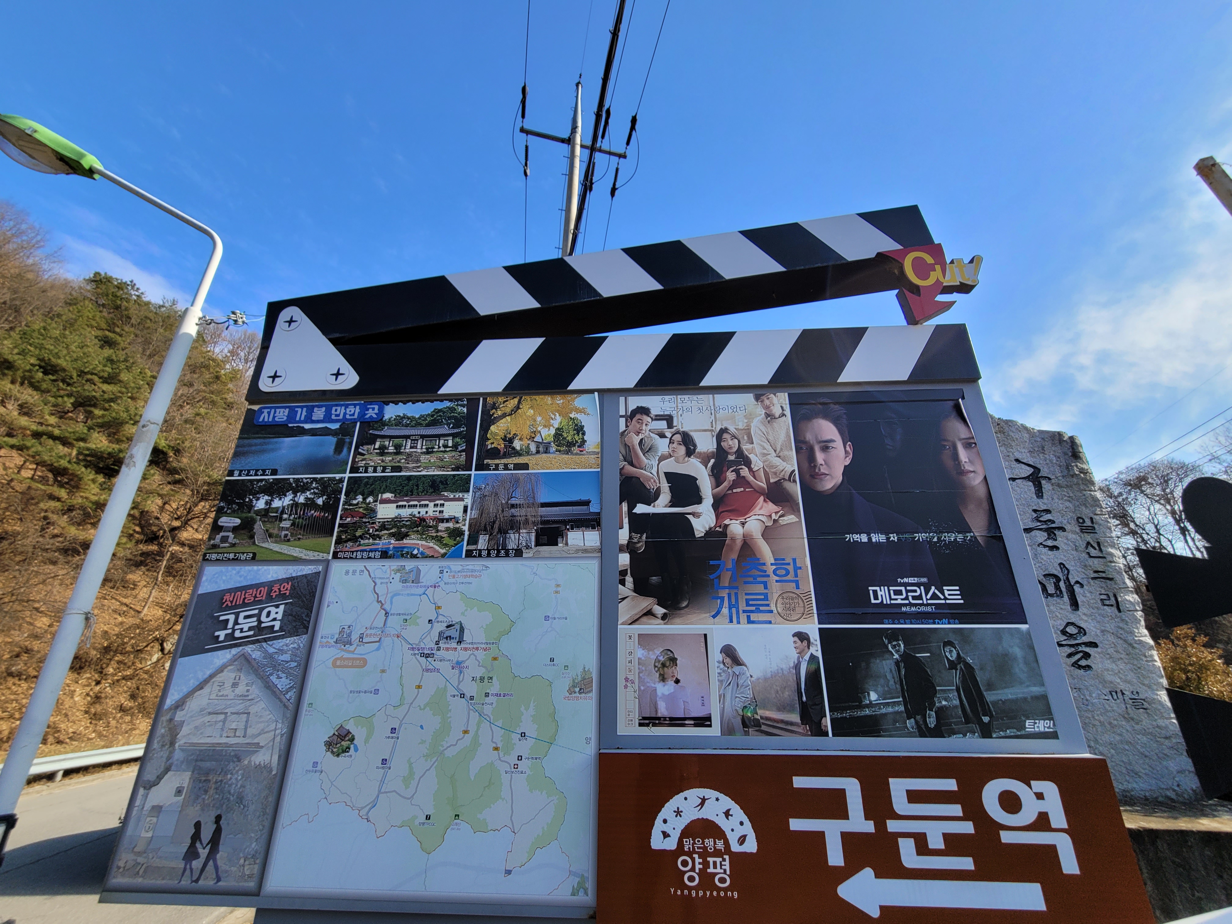 구둔역 앞에 영화 촬영지 홍보판입니다. 맨 위에 은행나무가 어우러진 구둔역사가 보입니다. 12월 31일까지 정비 중이라 구둔역 모습을 온전히 볼 수는 없지만요, 내년 1월 1일부터는 감성 깊은 구둔역을 볼 수 있을 겁니다. 구둔역에서 멀지 않은 곳에 앙증맞은 석불역이 있습니다. 저는 일정상 가지 못했는데요, 함께 보신다면 SNS 감성 뿜뿜~ 나는 멋진 여행을 하실 수 있을 겁니다.