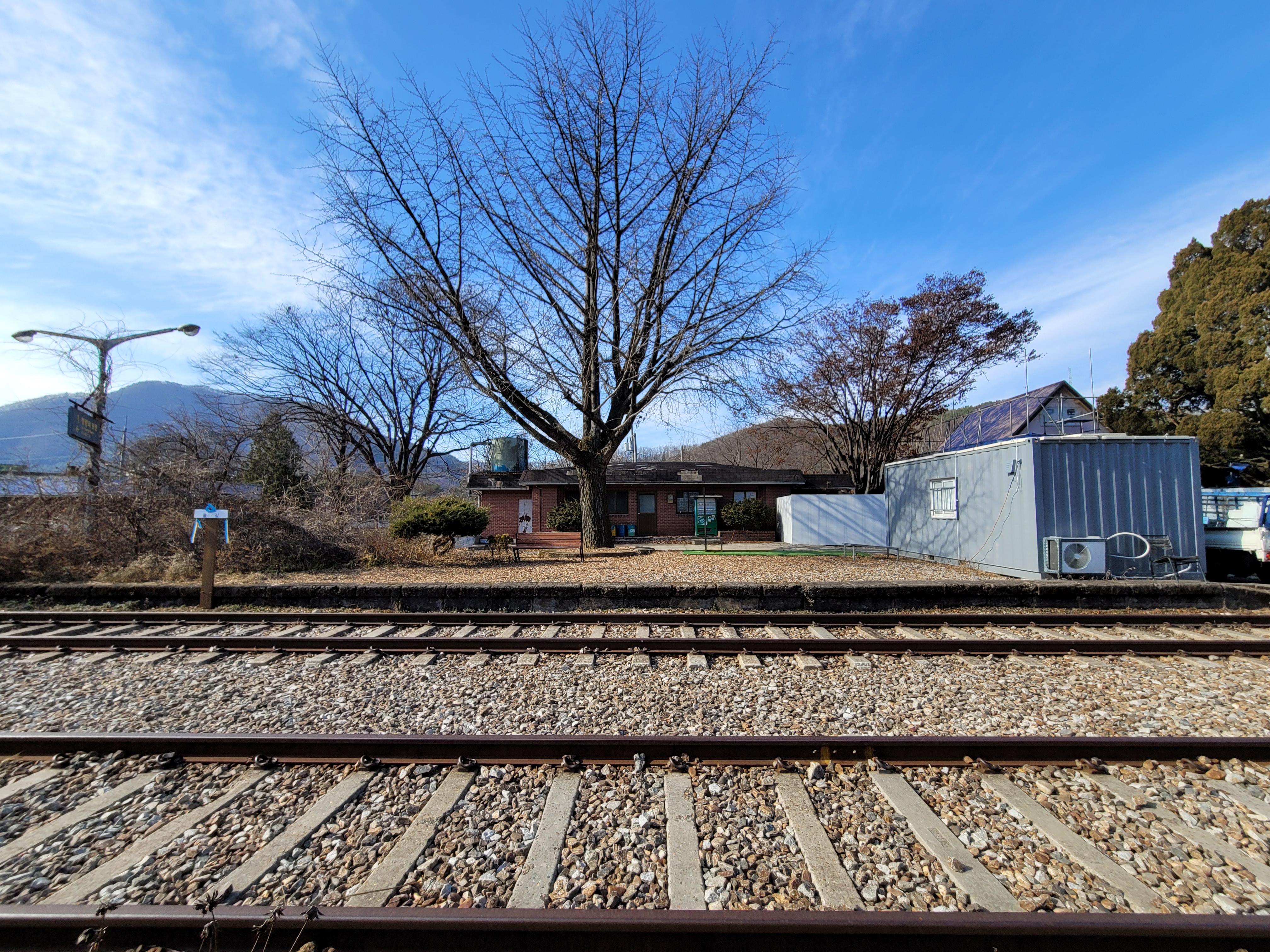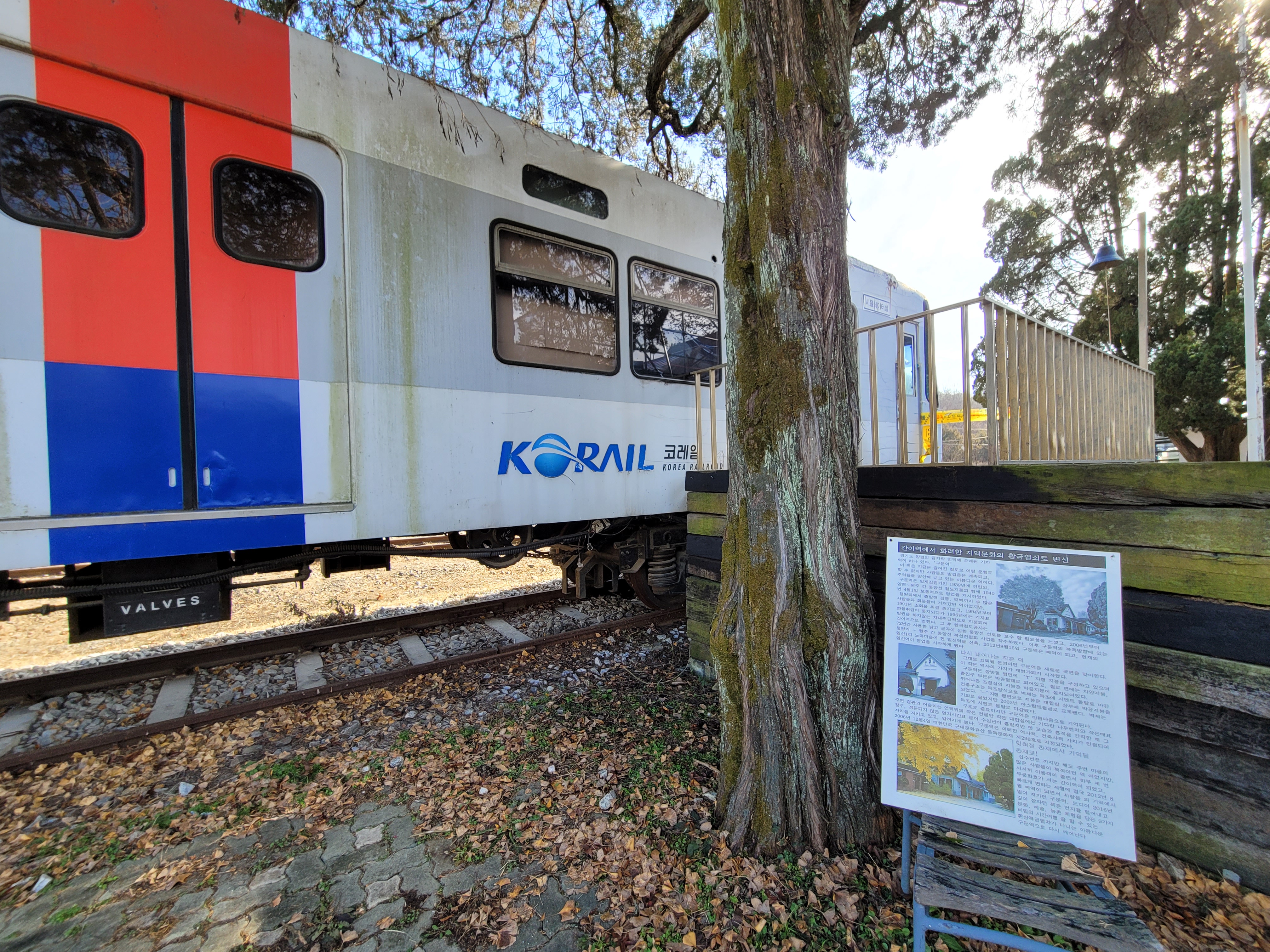 역사와 철로 사이에 오래된 은행나무가 한 그루 서 있습니다. 가을이면 노랗게 물들어 감성적인 풍광을 보여줍니다. 구둔역이 1939년부터 운영을 시작했는데요, 그 이후 지금까지 구둔역을 오갔던 사람들을 지켜보면서 그 자리를 지키고 있습니다.