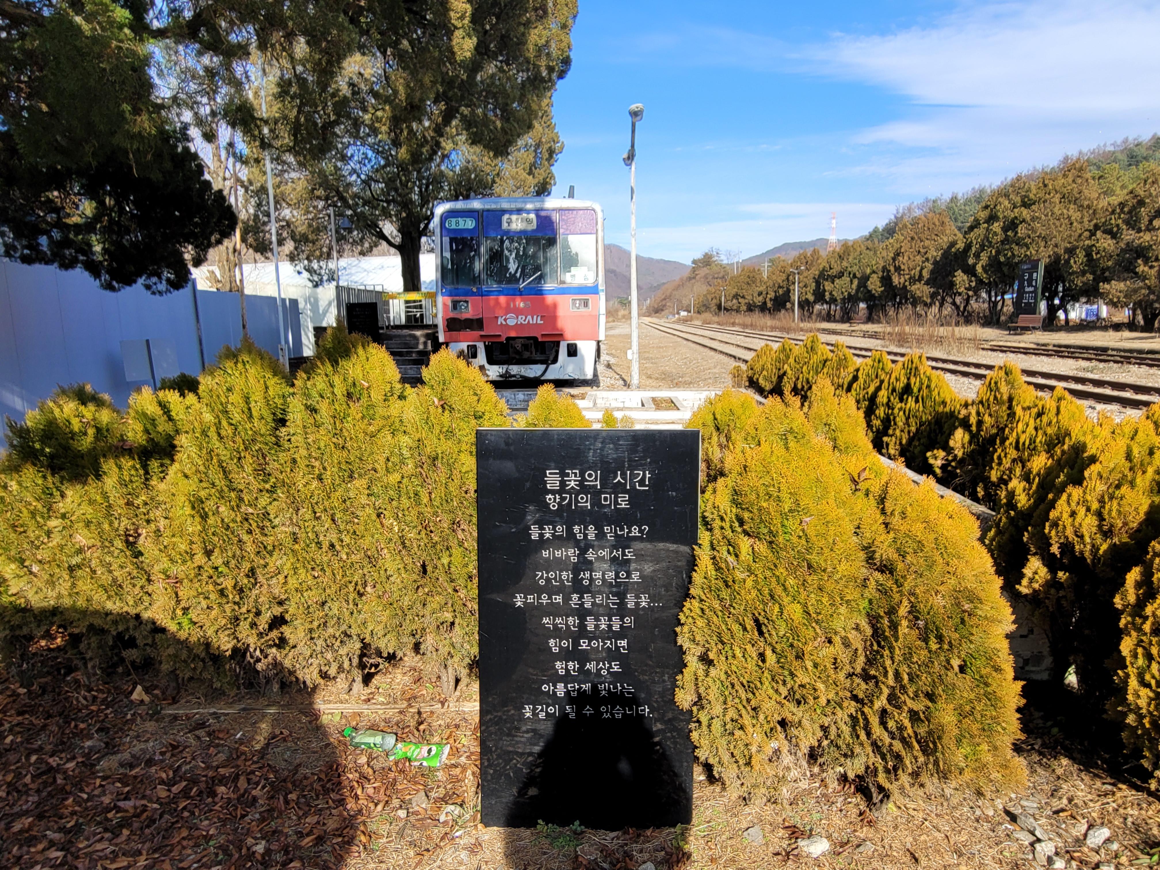 역사 밖으로 나가보니 옛날 역명 표지판이 그대로 남아 있습니다. 표지판은 녹슬고 낡았지만요, 레트로 감성을 느끼기에 충분합니다. 표지판 앞 의자에 앉아 누군가를 기다렸을 사람들이 떠오릅니다. 구둔역은 역사를 간직한 채 그자리에 그대로 있습니다.