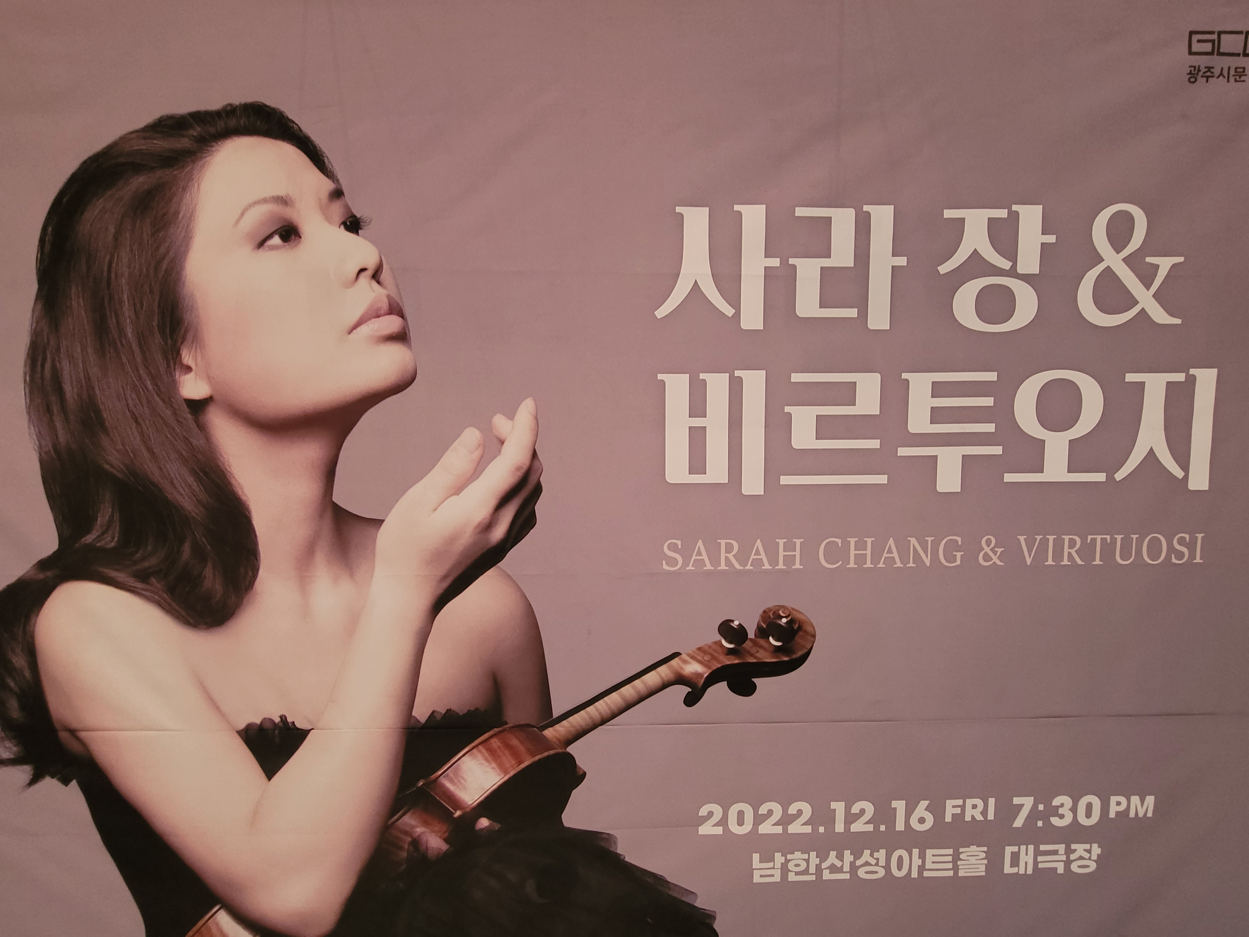 3년 만에 국내 무대에 서는 사라 장! 그녀의 전국투어 첫 무대가 12월 16일(금) 저녁 7시 30분 광주시문화재단 남한산성아트홀에서 있었습니다. 세계적인 바이올리니스트 답게 많은 시민이 사라 장을 보기 위해 남한산성아트홀에 모였습니다.