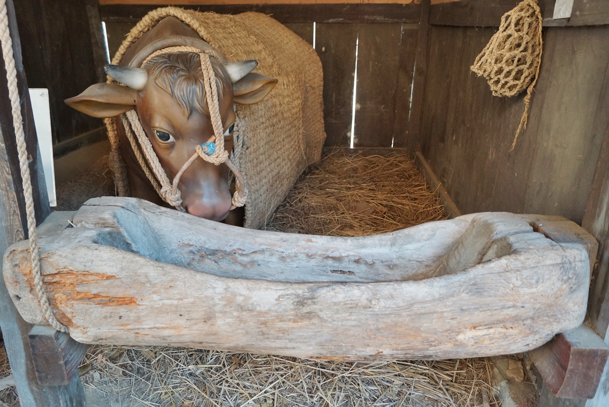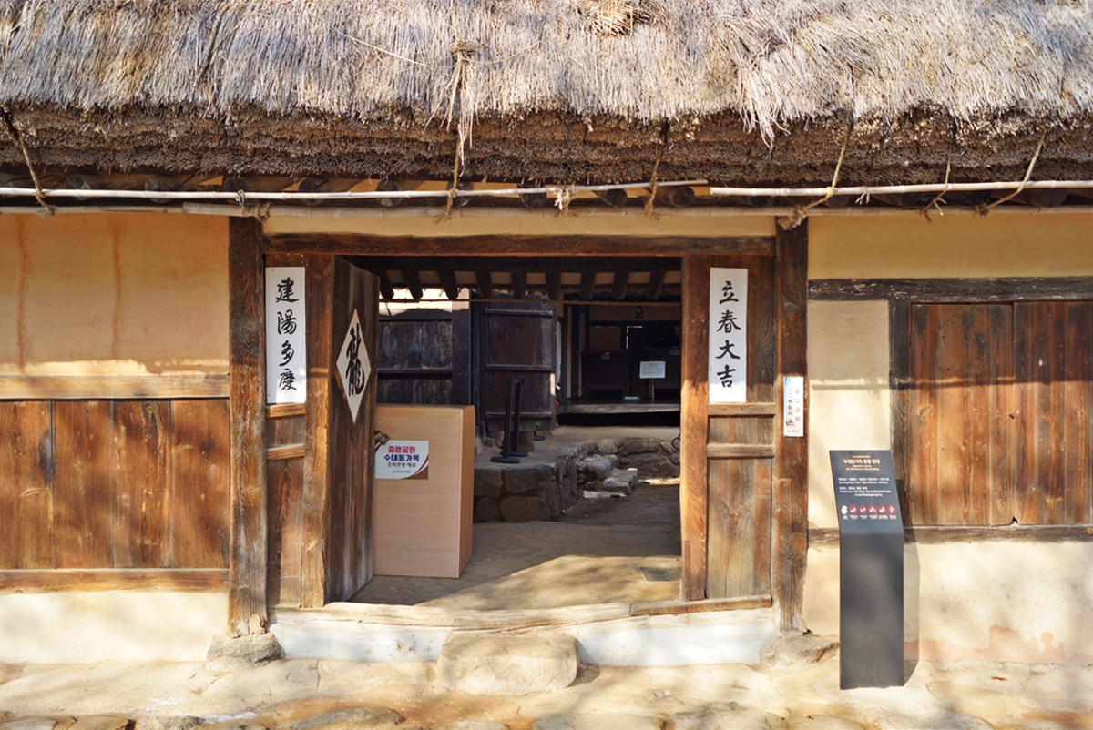 이제 외양간, 헛간으로 가보실까요? 중앙에 대문이 있고 왼쪽에는 외양간, 헛간, 뒷간이 있습니다. 외양간은 소들이 사는 집이죠. 우리나라는 밭갈이 등에 소가 반드시 필요해서 소를 가족처럼 생각해 집안에서 키웠습니다.