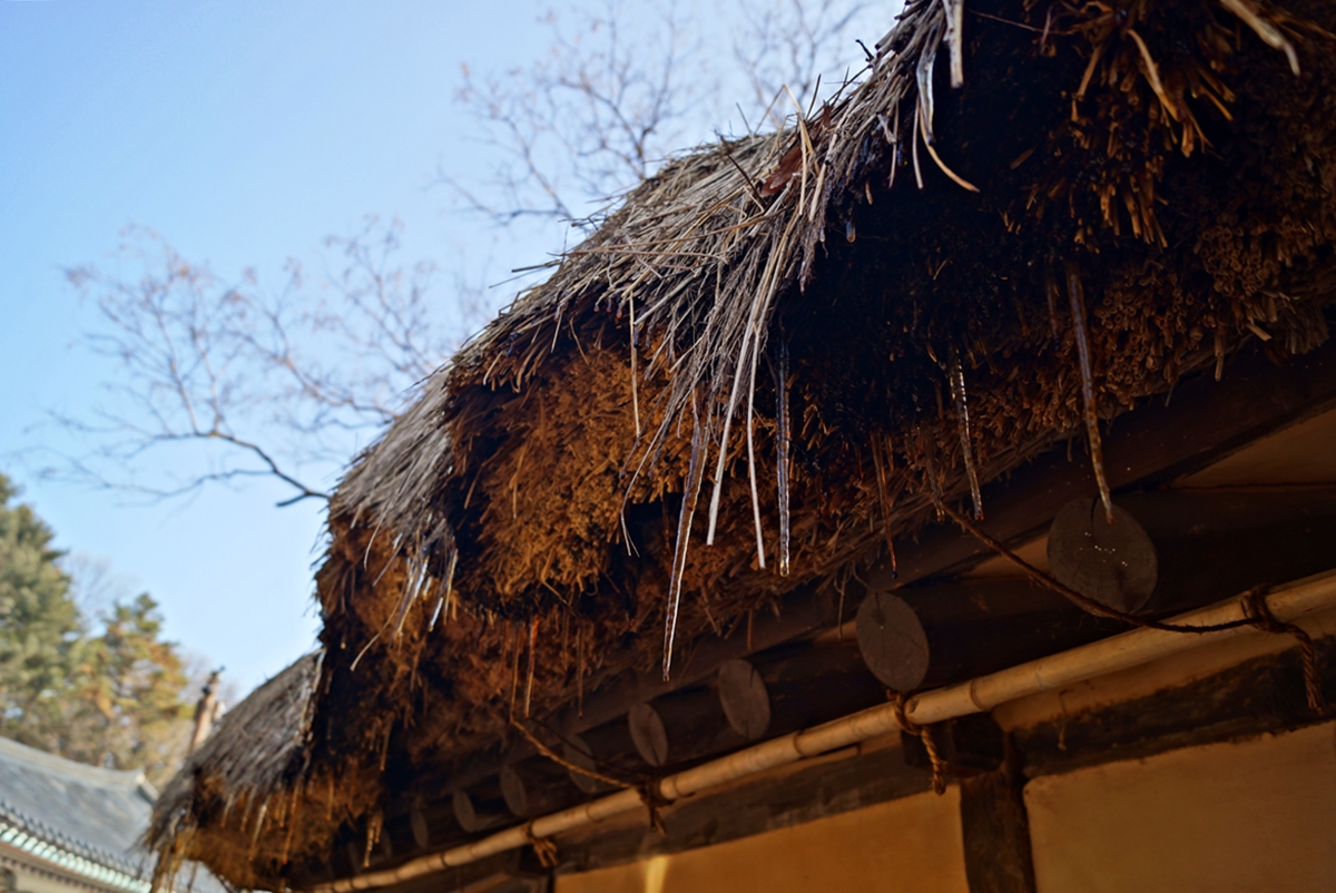 초가집 처마 밑에 고드름이 매달려 있습니다. 옛날에는 겨울에 얼음과자라고 해서 고드름을 따먹기도 했지요.