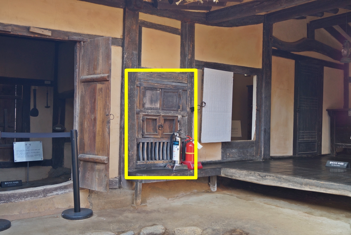 부엌에서 대청마루로, 안방으로 음식을 나를 수 있도록 조그맣게 창문을 만들어 놓았습니다. 부엌에서 음식 냄새가 빠질 수 있도록 나무 창살로 환기창을 만들어 놓은 것을 보면 지혜를 엿볼 수 있네요.