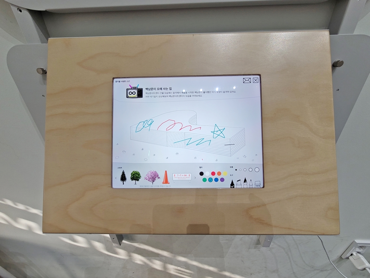 저는 ‘연보’ 체험해봤는데요, 백남준의 생애, 활동, 작품 등 세 가지로 나뉘어 있습니다. 그중 백남준이 오래 사는 집을 보니 백남준아트센터 건물과 비슷합니다. 음악과 예술을 사랑한 백남준이 좋아했던 악기 모양이 숨겨져 있는데요, 어떤 악기일지 상상해보며 백남준아트센터를 나만의 개선으로 꾸며볼 수 있습니다.