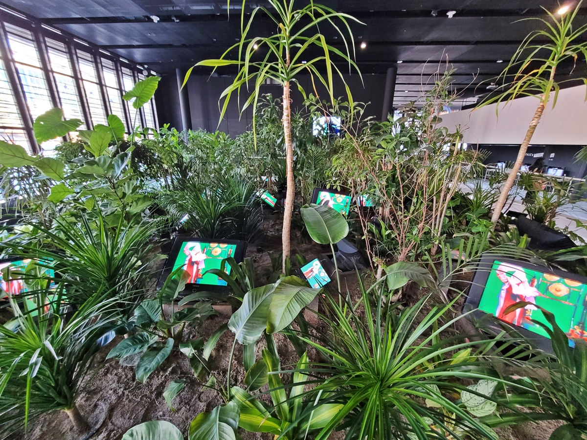 식물 정원 곳곳에 TV 모니터가 있습니다. 우거진 수풀 속에 텔레비전들이 꽃송이처럼 피어있는 것처럼 보입니다. 그래서 작품명이 ‘TV 정원’입니다. 화면에 나오는 것은 ‘글로벌 그루브’라는 비디오 작품입니다. 세계 각국, 여러 분야의 음악과 춤이 특유의 편집으로 흥겹고 현란하게 이어집니다.
