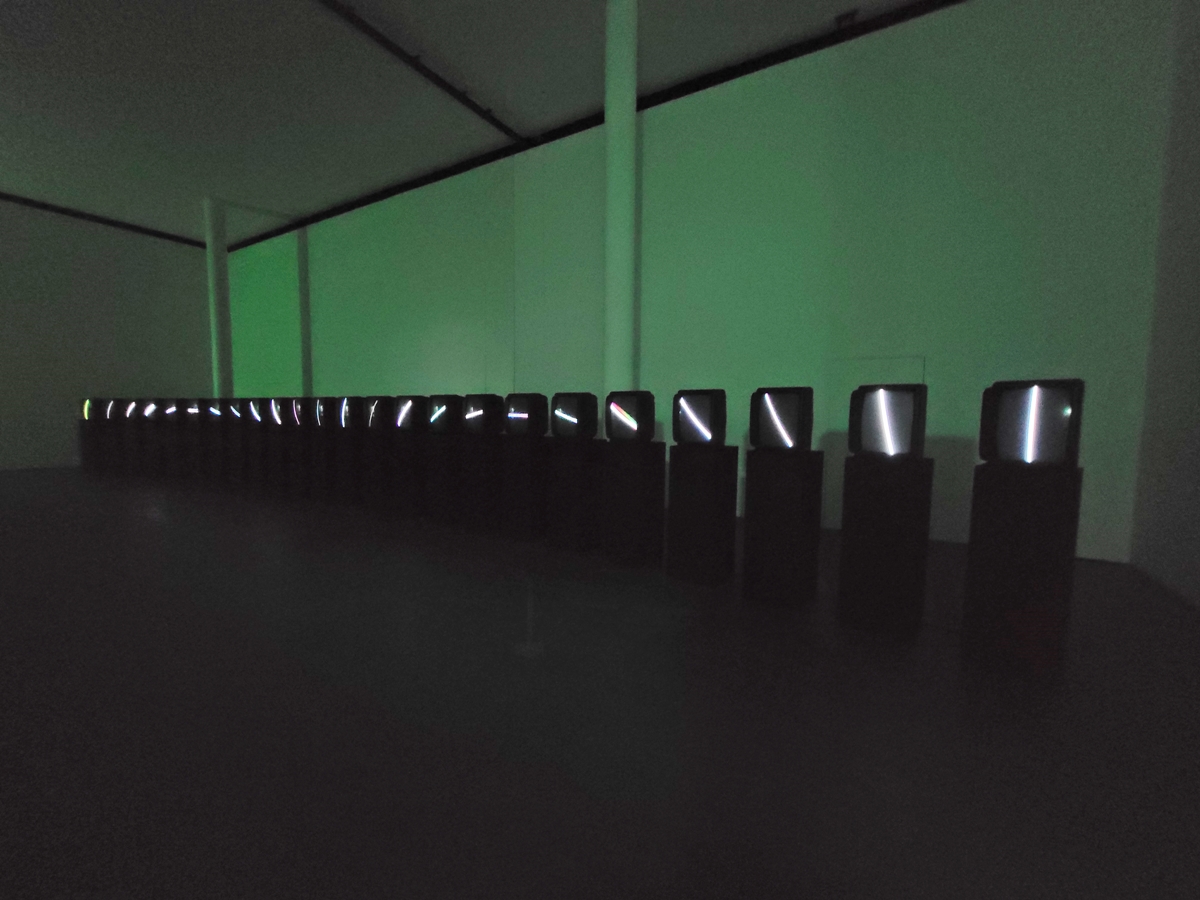 어두운 방에 24대의 TV 모니터가 있는데요, 이게 뭘 의미하는 걸까요. 이 작품명은 ‘TV 시계’입니다. 24개의 모니터로 시계의 바늘이 12시간을 밤과 낮에 걸쳐 2회 회전하는 것을 형상화한 작품이라고 합니다.