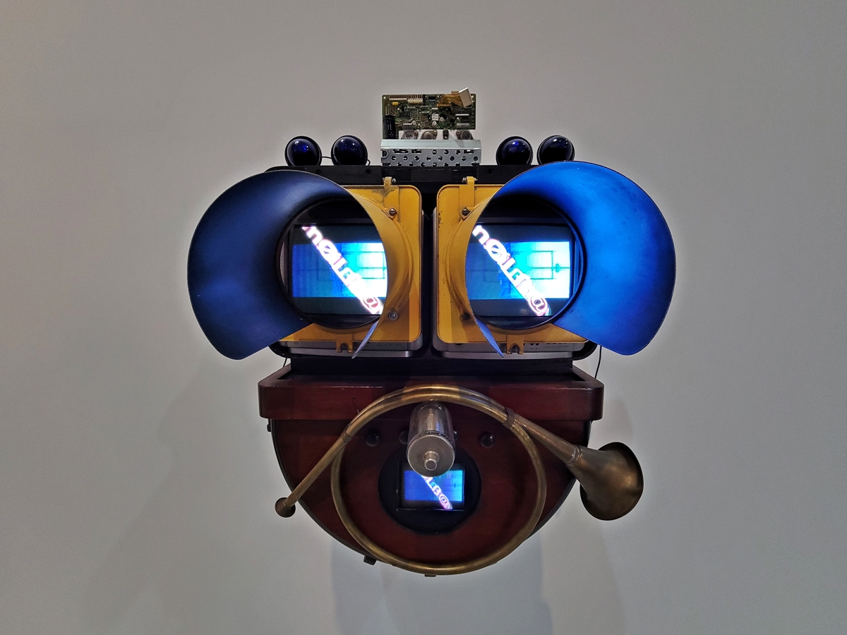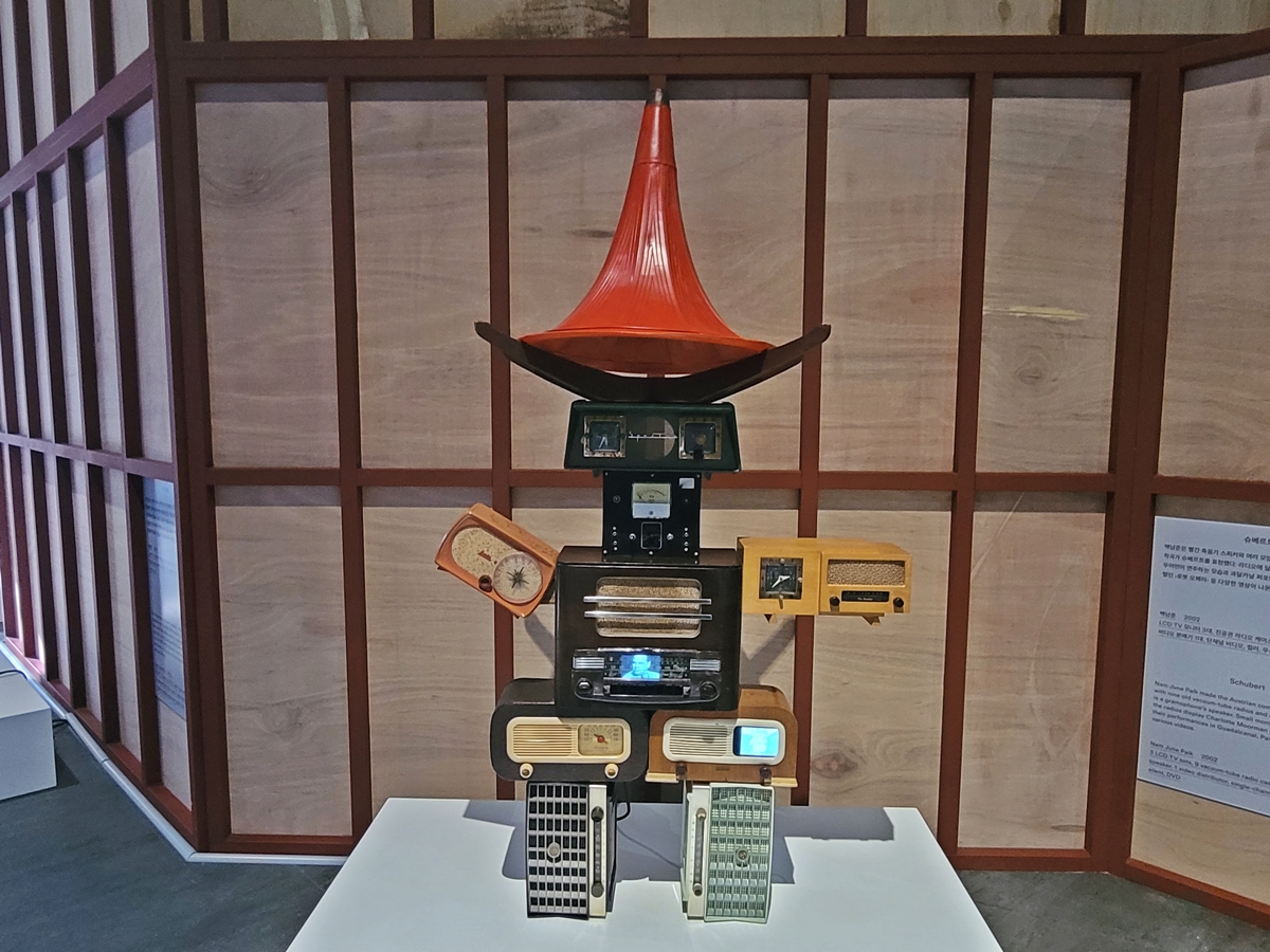 이 작품은 곤충의 얼굴처럼 생겼네요. 작품명 <하이웨이 해커>입니다. 노란색 신호등으로 오브제와 거꾸로 부착한 엔틱 라디오 케이스가 각각 눈과 입을 구성하고 있습니다. 그 속에 텔레비전 모니터를 삽입한 얼굴 형상의 TV 로봇인데요, 미래 사회의 인간상을 담은 TV 조각으로 평가된다고 합니다.