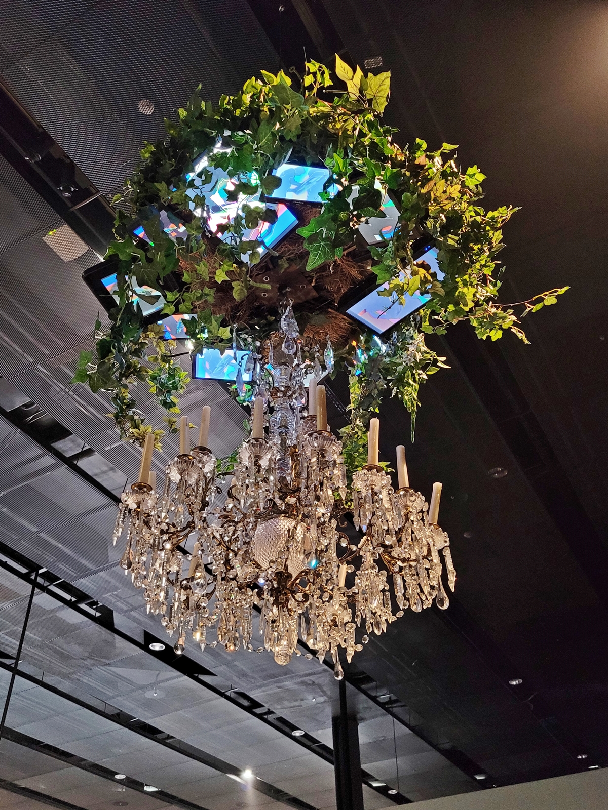 2전시실에서 가장 눈에 띄는 것은 ‘비디오 샹들리에’ 작품입니다. 천정에 샹들리에가 매달려 있고, 주변에 TV 모니터가 있습니다. 백남준의 비디오 샹들리에는 텔레비전을 촛불 삼아 이미지와 빛을 내고 있습니다. 텔레비전 모니터와 나뭇잎 밑으로 푸른 조명의 샹들리에에 달린 것이 아주 특이합니다.