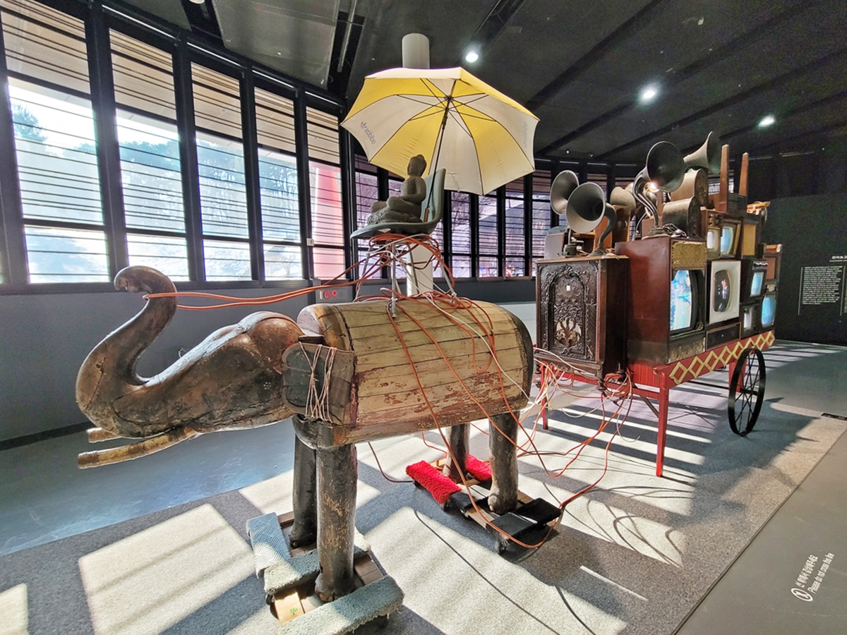 코끼리가 수레를 끌고 있는 작품인데요, 아주 큰 작품입니다. 코끼리 위를 보면 우산을 쓰고 있는 불상이 있습니다. 작품이 ‘코끼리 수레’인데요, 수레에는 백남준이 즐겨 사용한 텔레비전, 라디오, 측음기가 가득 쌓여 있습니다.