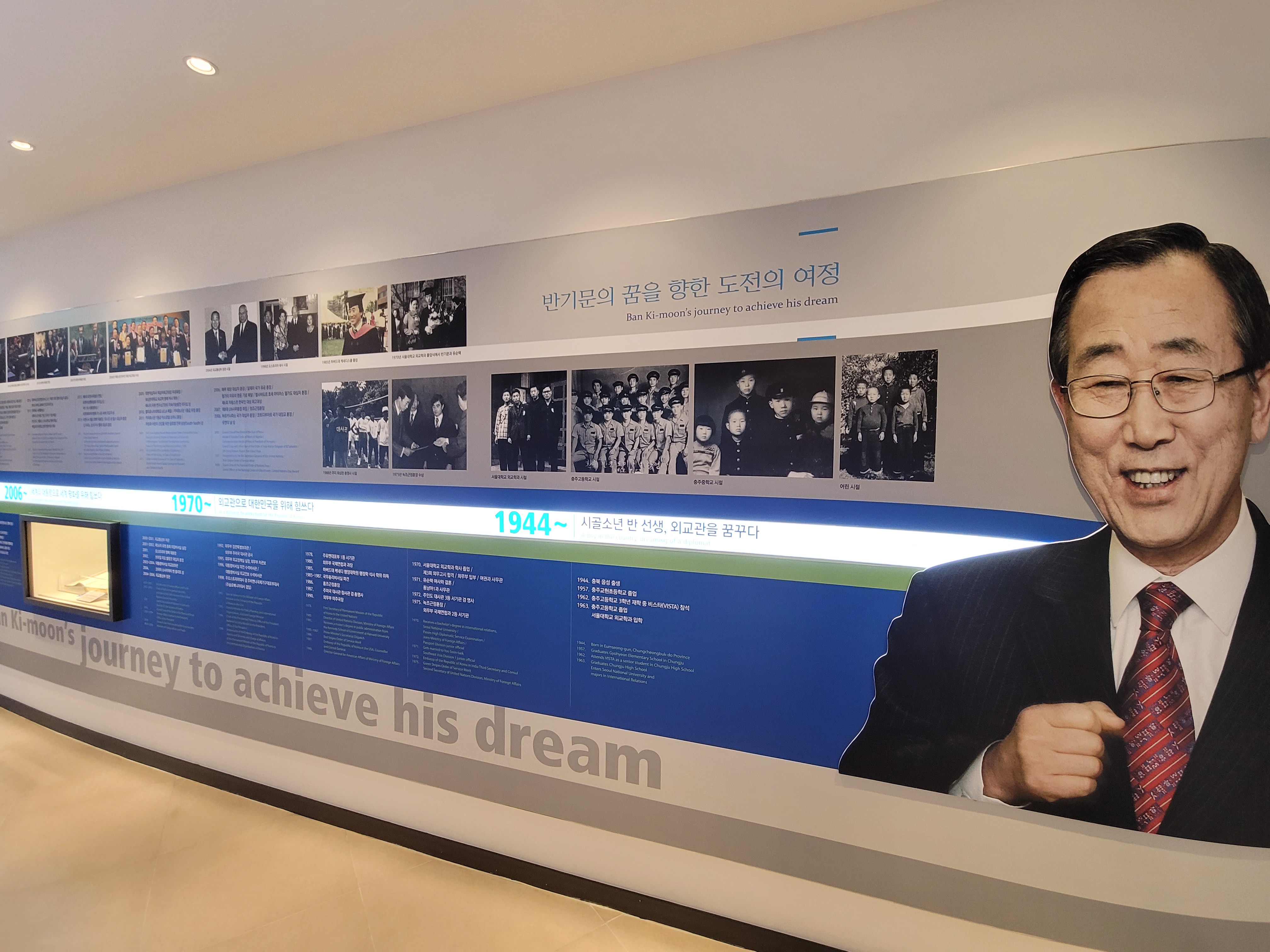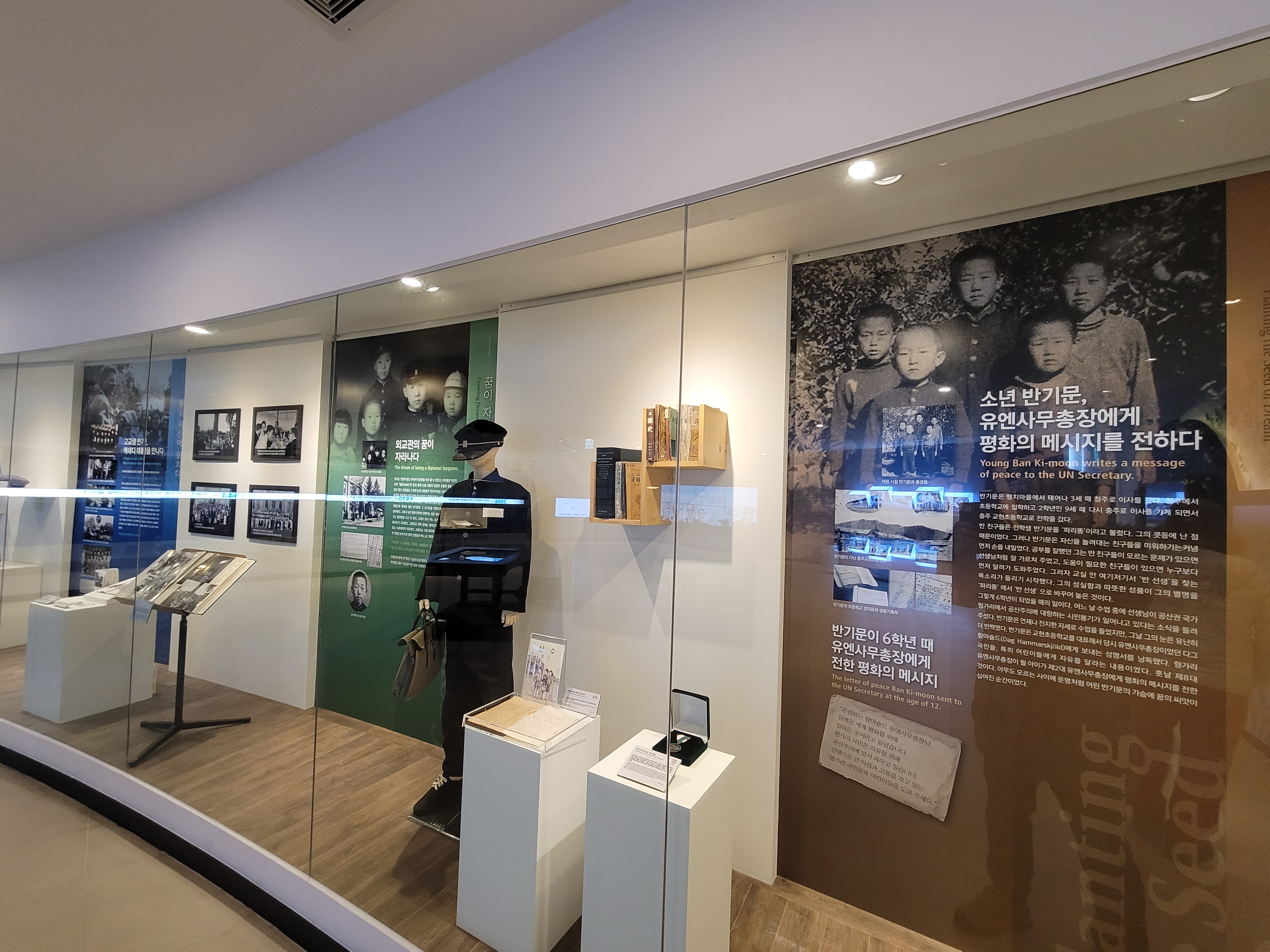 2층에 있는 반기문 기념실입니다. 세계를 품은 반기문의 탄생과 꿈을 향한 도전의 여정이 전시되어 있습니다.