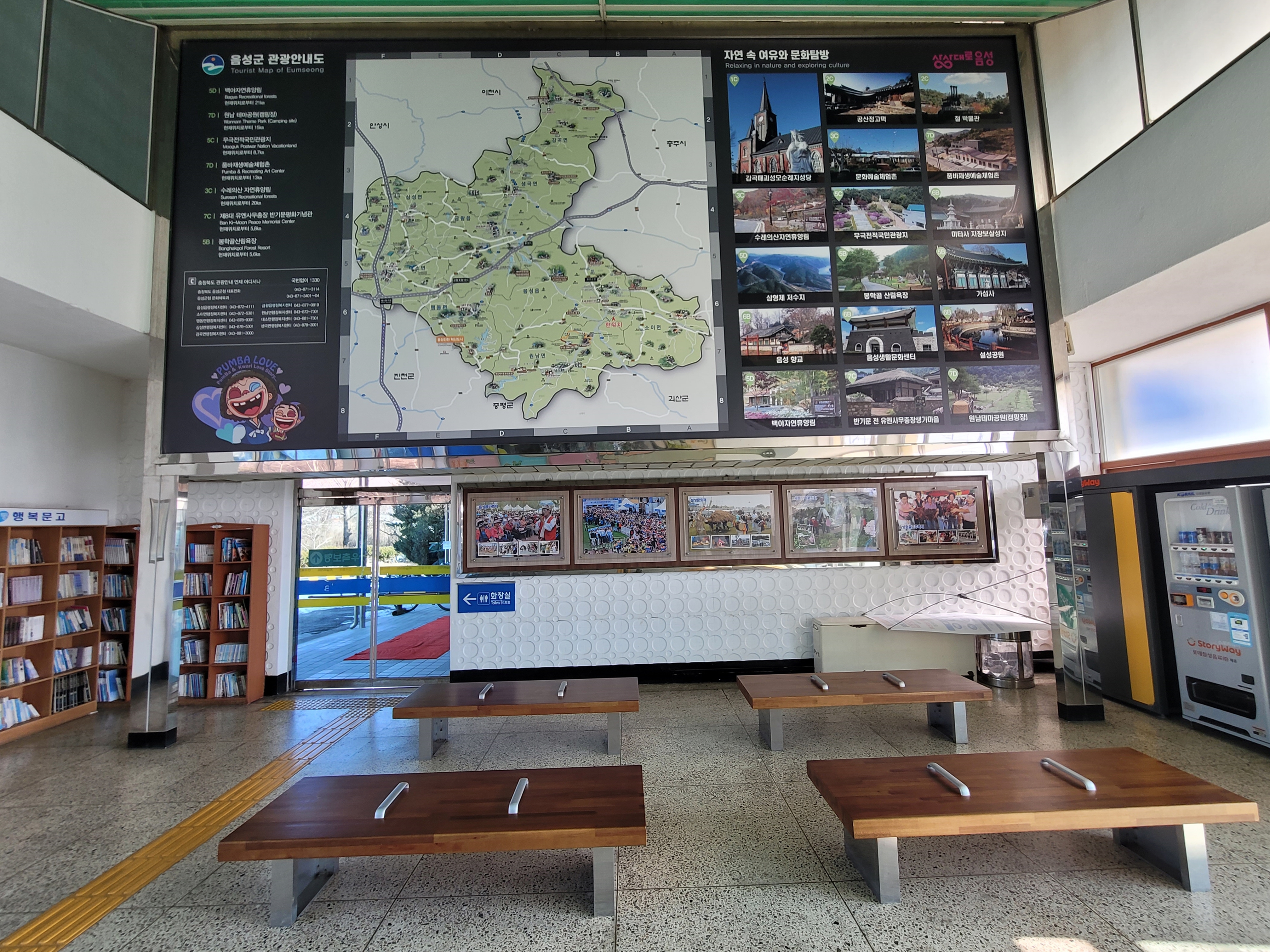 음성역사 안으로 들어가보니 음성군 관광안내도와 문화탐방지가 소개되어 있습니다. 음성은 수도권에서 가깝지만 잘 알려지지 않은 관광지도 많습니다. 저는 음성 관광 코스 중에서 반기문 생가 주변을 둘러보려 합니다.