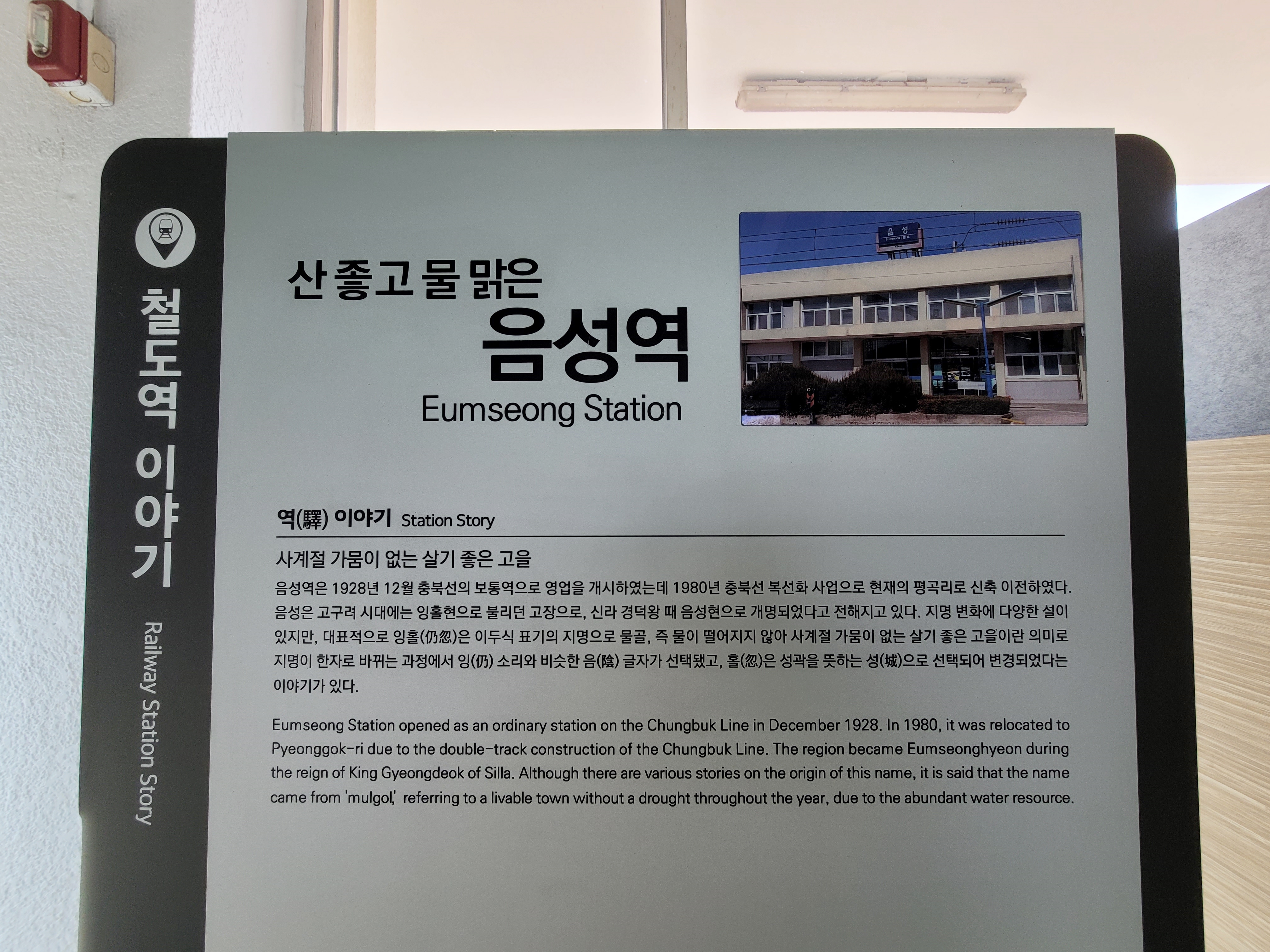 수원역에서 음성으로 가는 무궁화호 열차는 저녁 6시 32분입니다. 열차편이 매일 한 차례 밖에 없습니다. 그래서 금요일과 주말에는 2~3일전에 매진되는 경우가 많습니다. 저는 평일에 다녀왔습니다. 음성역은 1928년 12월 25일 읍성읍 오성동에서 보통역으로 영업을 개시, 1980년 충북선 복선화로 현재의 평곡리로 이전하여 신축, 오늘날까지 이어지고 있습니다.