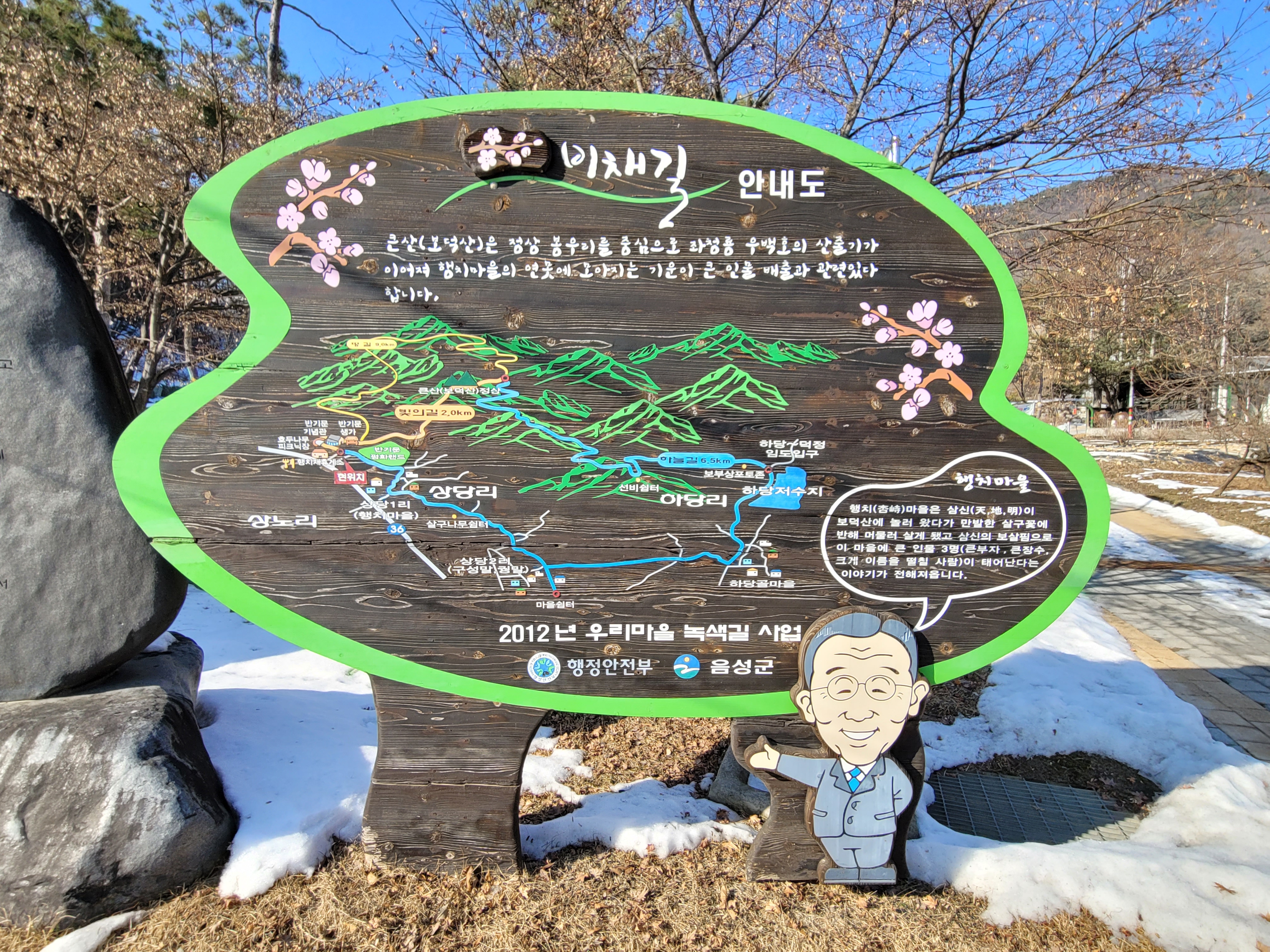 반기문의 생가가 있는 행치마을은 '살구나무가 많은 고개'라는 뜻을 가지고 있습니다. 그리고 광주 반 씨 장절공 행치파의 집성촌이었습니다. 세 개의 산봉우리로 이루어진 보덕산(큰산)은 병풍처럼 둘러싸여 있습니다. 예로부터 이 마을에는 삼신(天, 地, 明)이 보덕산에 놀러왔다가 만발한 살구꽃에 반해 머물러 살게 되었고, 이들의 보살핌으로 이곳에서 큰 인물 3명(큰 부자, 큰 장수, 크게 이름을 떨칠 사람)이 태어날 것이라는 이야기가 전해져 내려온다고 합니다. 크게 이름을 떨칠 사람이 반기문 총장이 아닐까요.