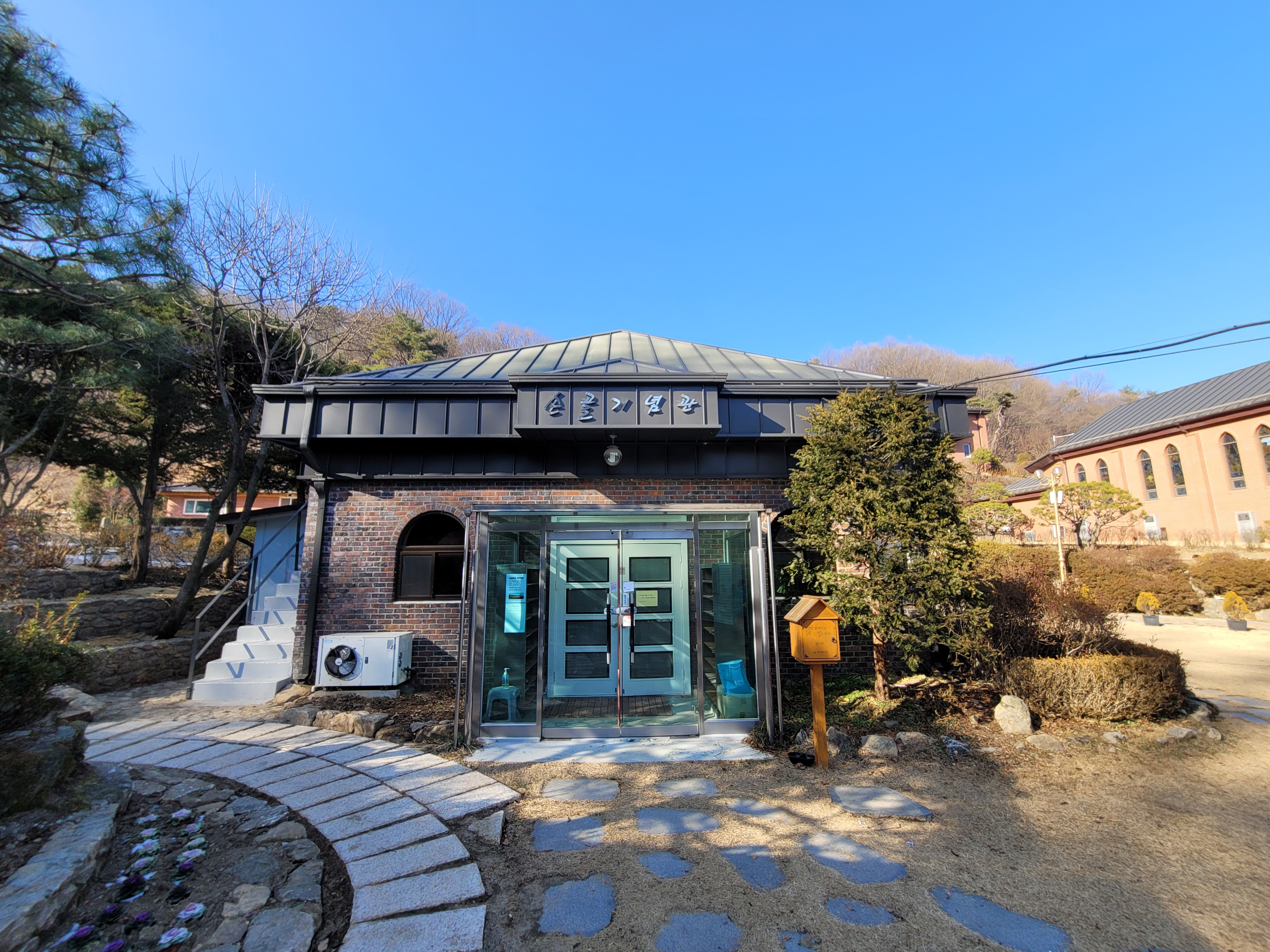 성당에서 내려와 손골기념관으로 갔습니다. 이곳은 갈 때마다 문이 잠겨 있었는데요, 이번에는 문이 열려 있었습니다. 기념관 앞에 청년 김대건 길 스탬프 함도 있습니다.