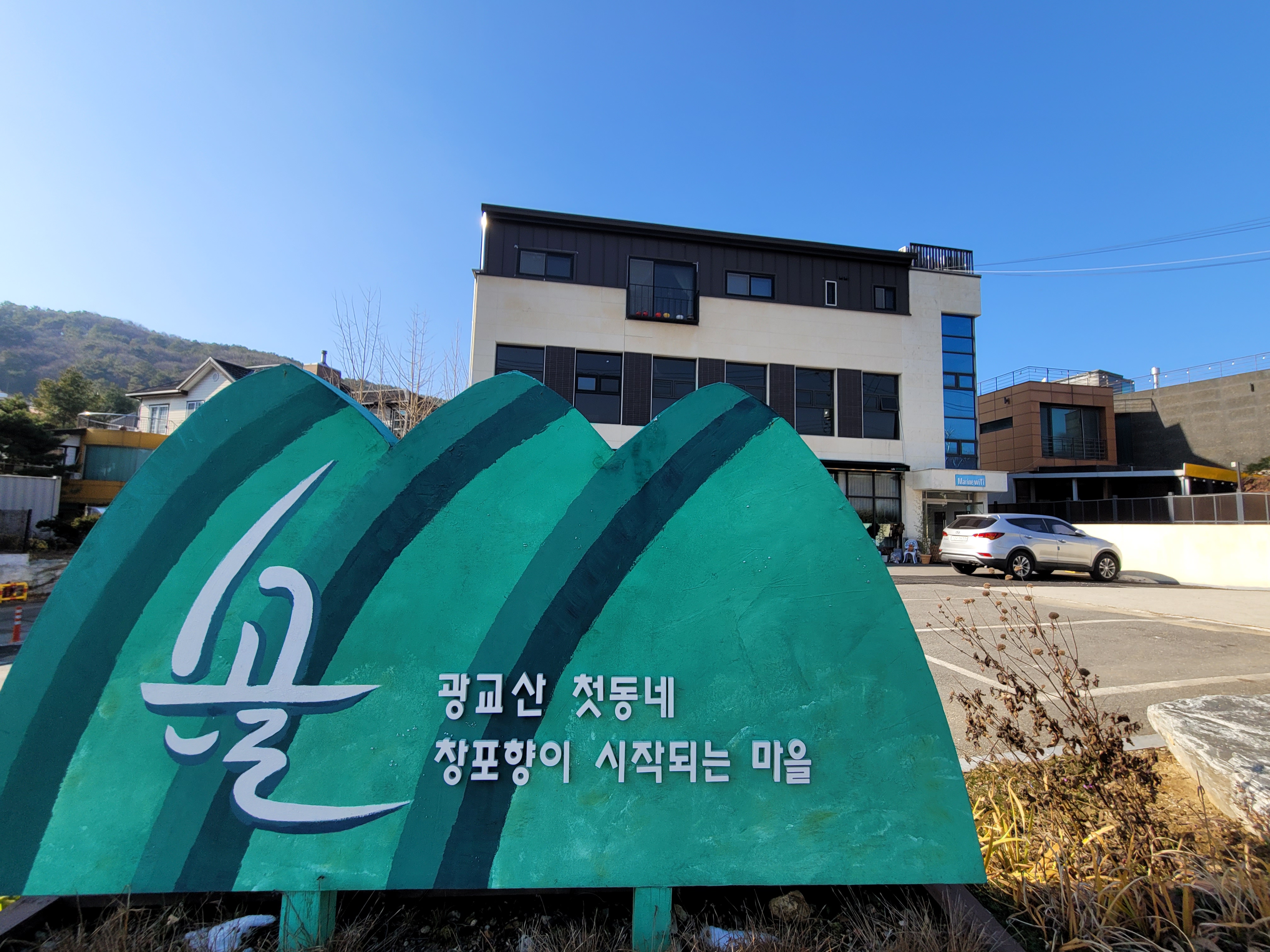손골성지로 들어가는 길은 전원주택이 많은 곳입니다. 성지 입구에 '광교산 첫동네, 창포향이 시작되는 마을' 안내판이 있네요. 그만큼 공기 좋고 물 맑은 곳이죠. 하지만 도로가 좁아서 교행이 어려운 곳도 있으니 주의해야 합니다.